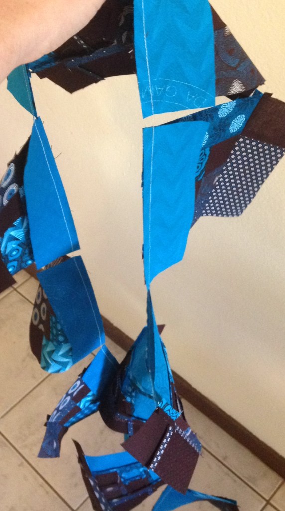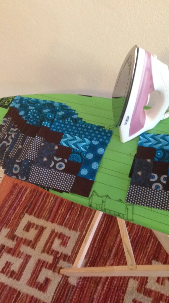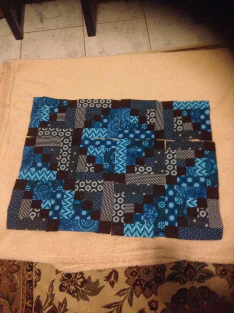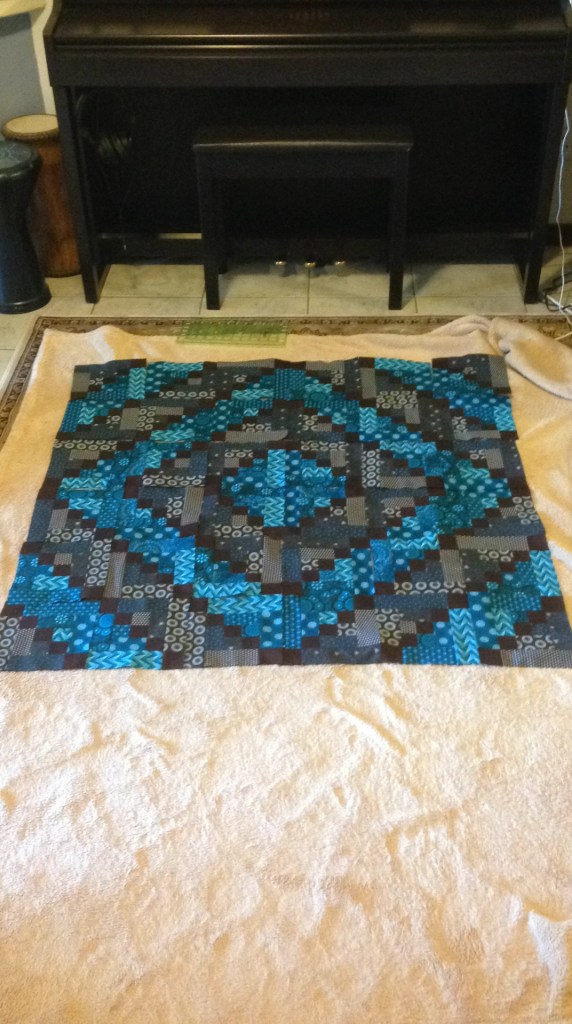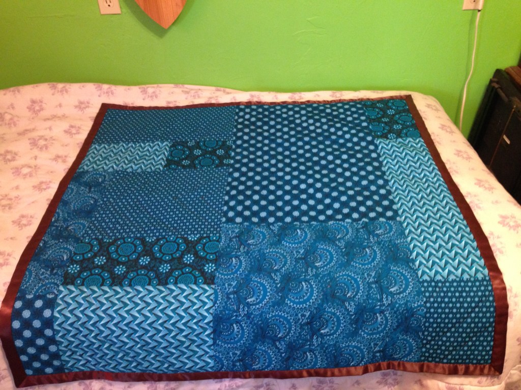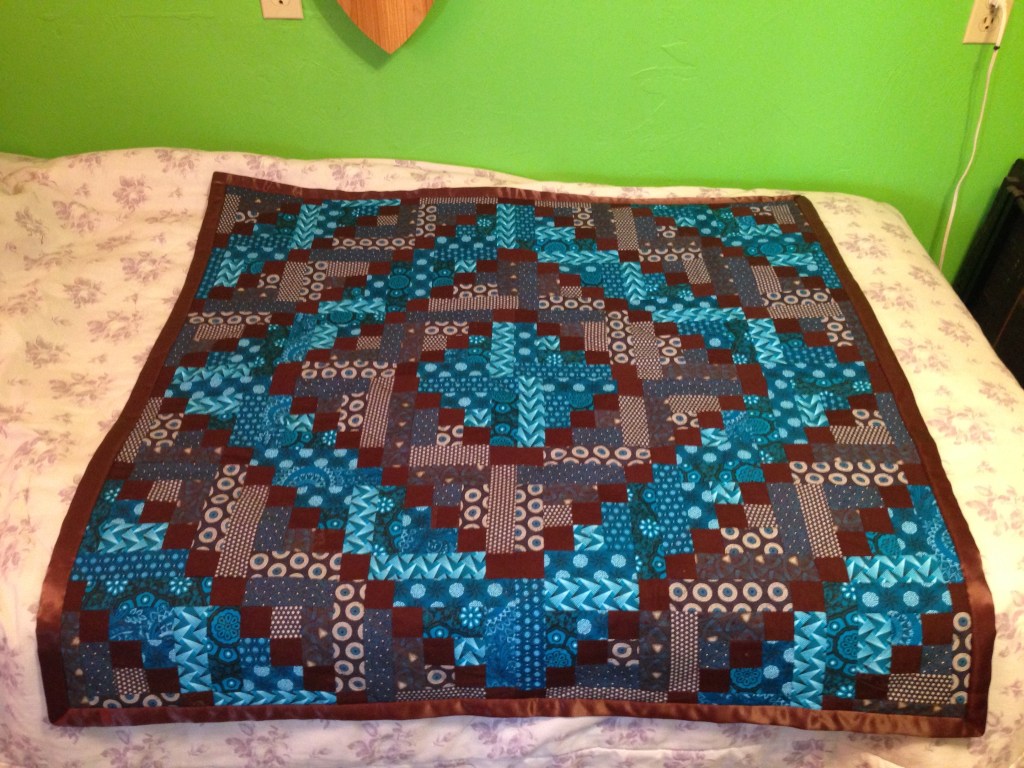This was one of my first experiments with the log cabin pattern. It’s a 1-meter square baby blanket made from blue and brown variations of South African shweshwe prints. I really enjoyed the effect of the geometric prints within the log cabin blocks. There is no arrangement to the specific prints, though I did try to make sure each one was was fairly represented throughout the design. For the final quilting, I was limited at the time by my own inexperience and the size of my little BabyLock machine, so I kept to diagonal lines on either side of the brown squares.