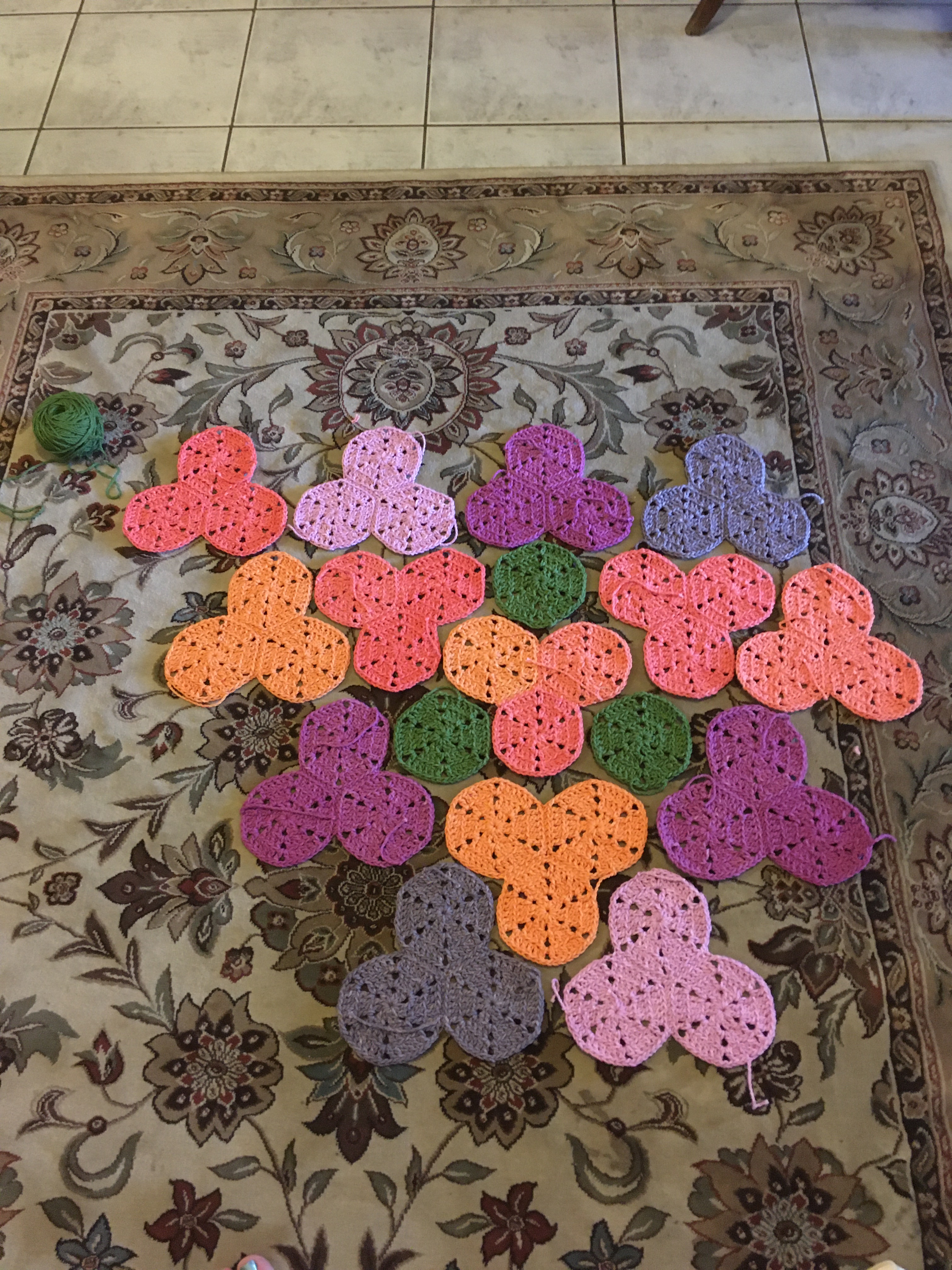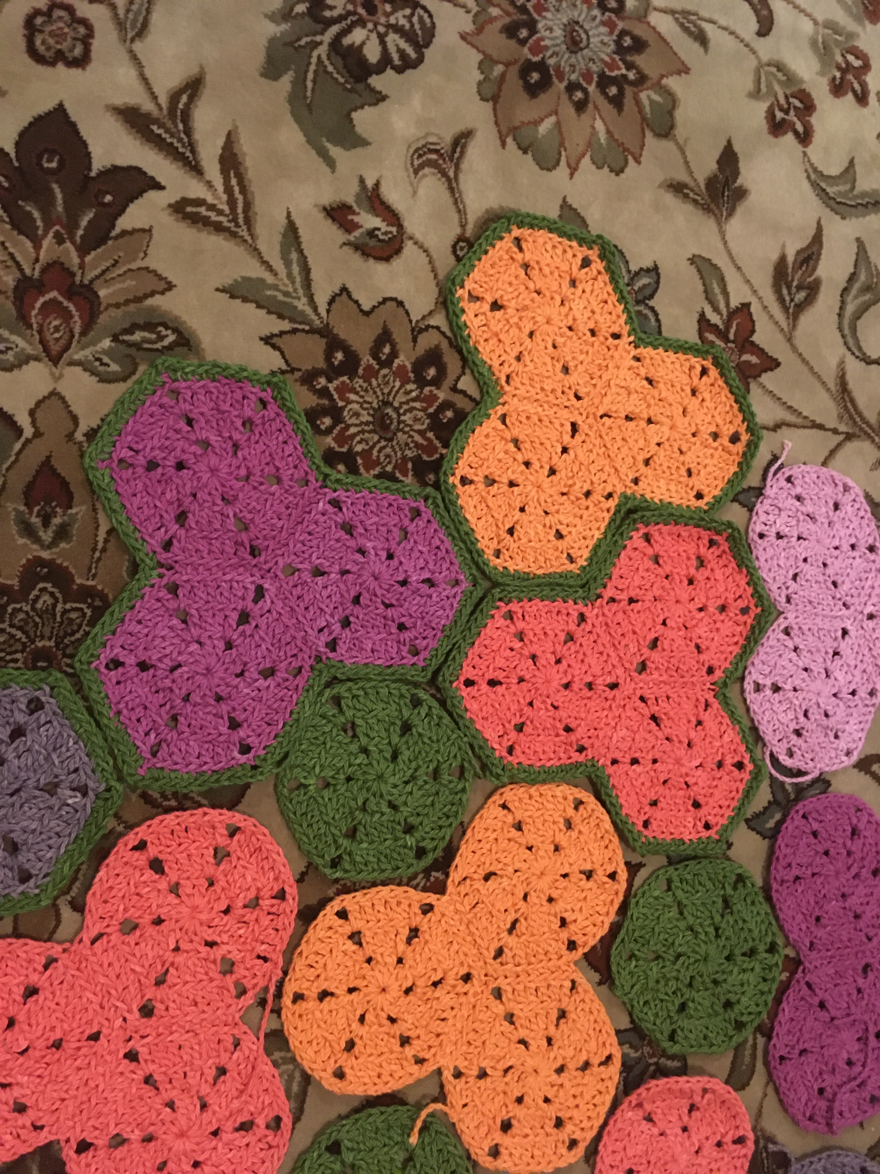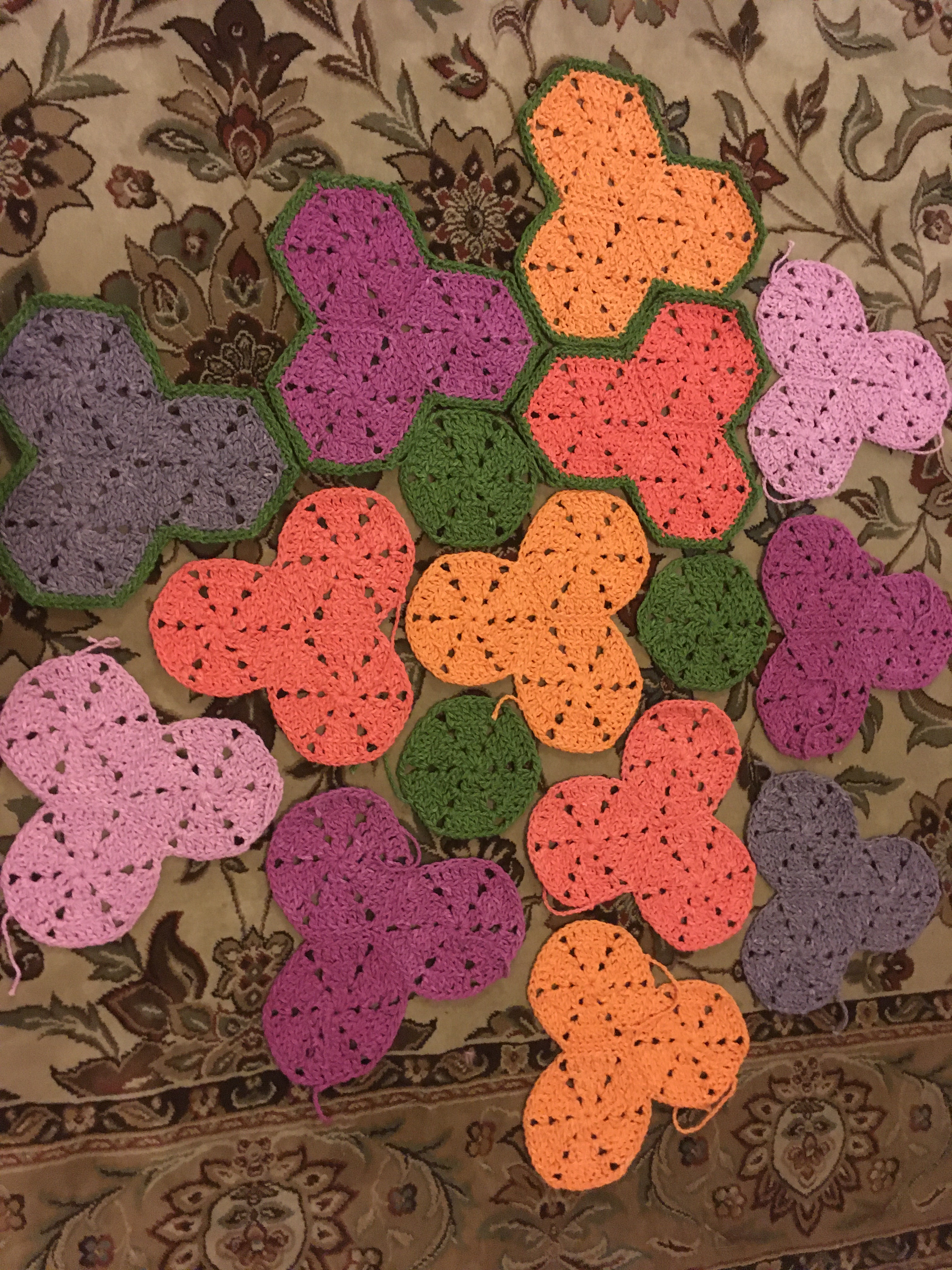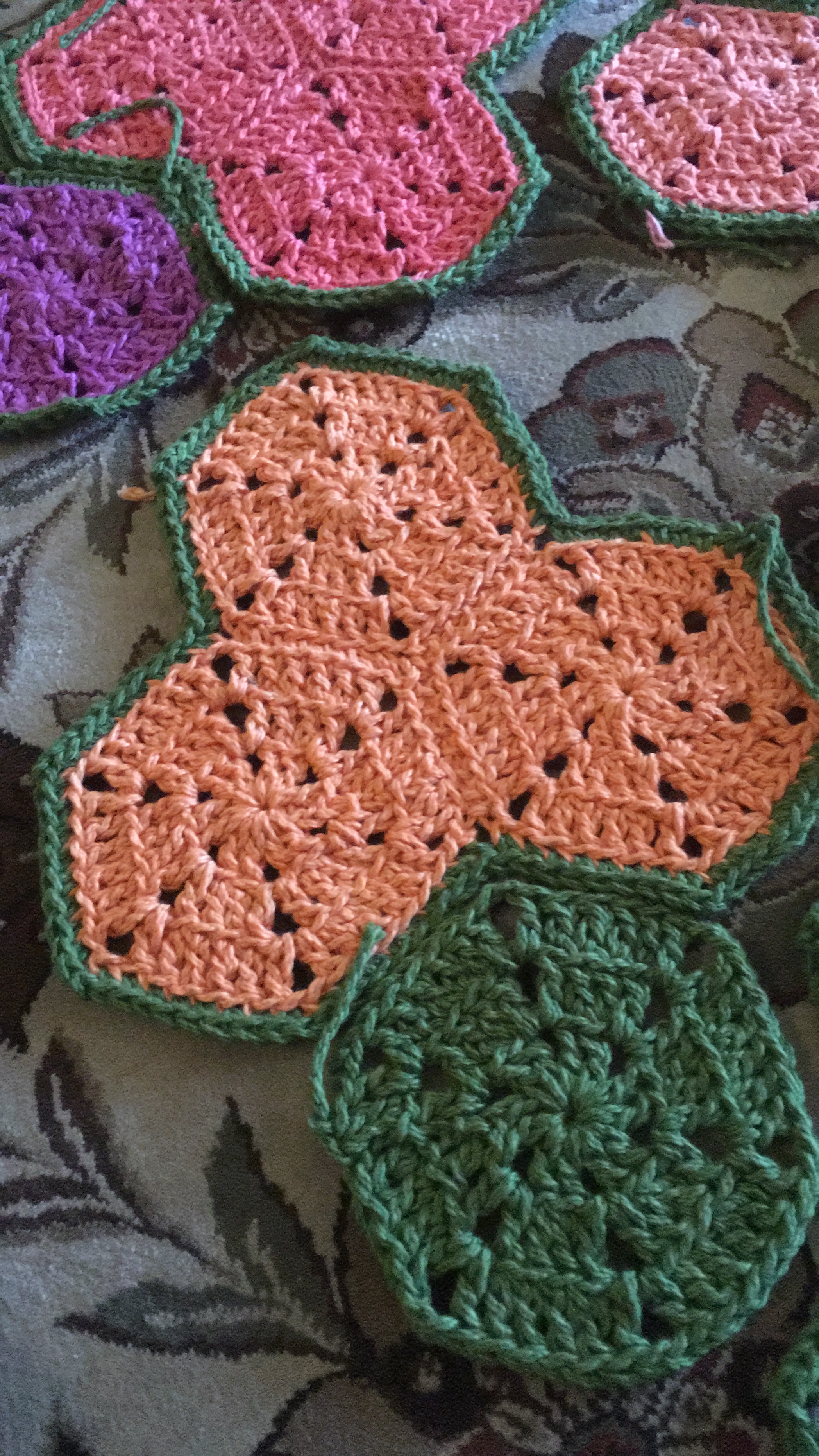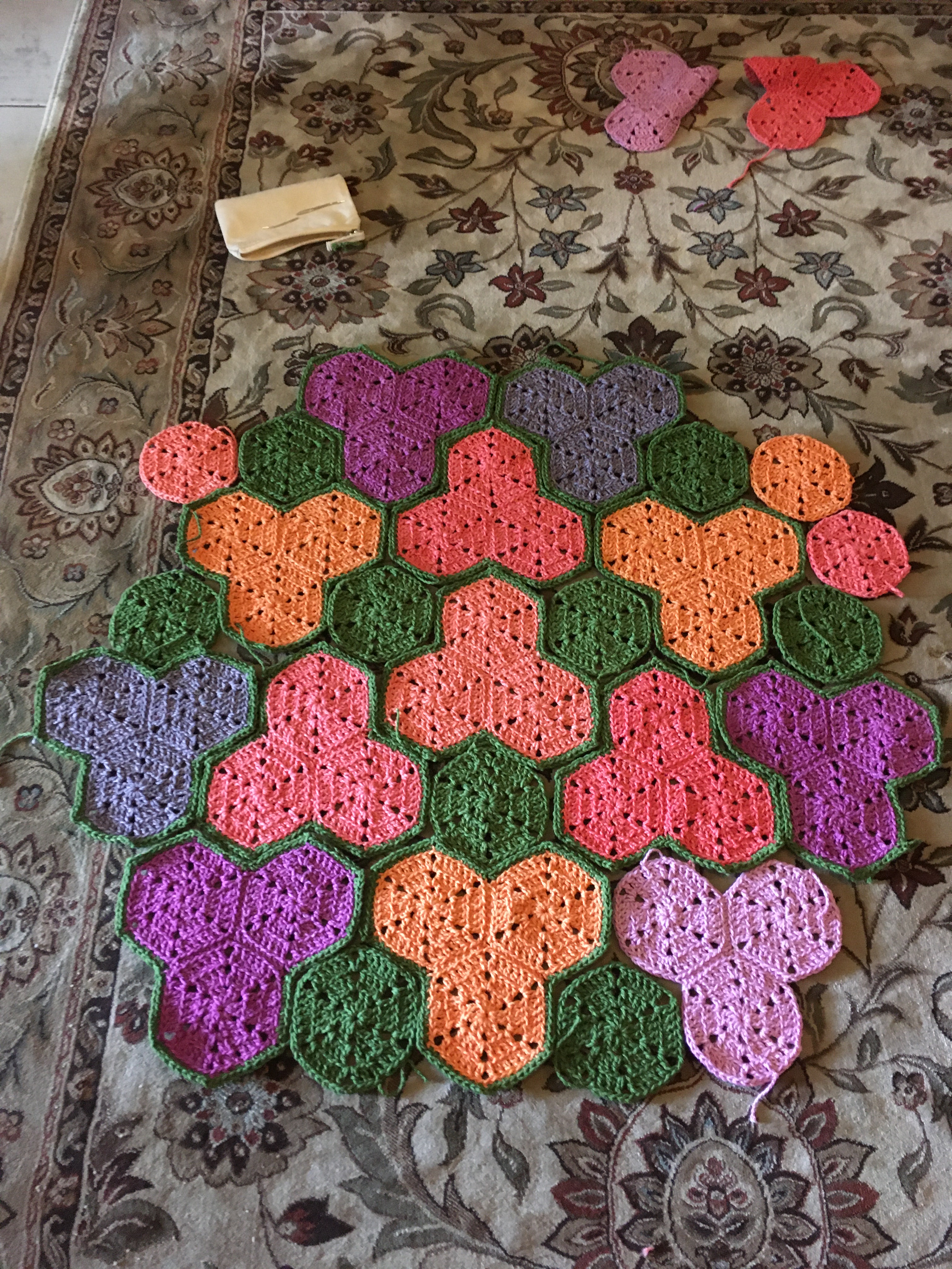 I started in January with yarn left-over from the previous summer’s projects, and I was drawn back to the hexagonal patches that I had done a few years ago. So, I started making hexagons. Then I got low on yarn … but I tried to keep the project to what I had. Once I started putting the hexagons together, I kept thinking of the asymmetry of bougainvillea flowers and knew I didn’t want a regular square or rectangular blanket, but I just couldn’t settle on a pattern. It took me from January to May to finally make the different decisions and finally finish!