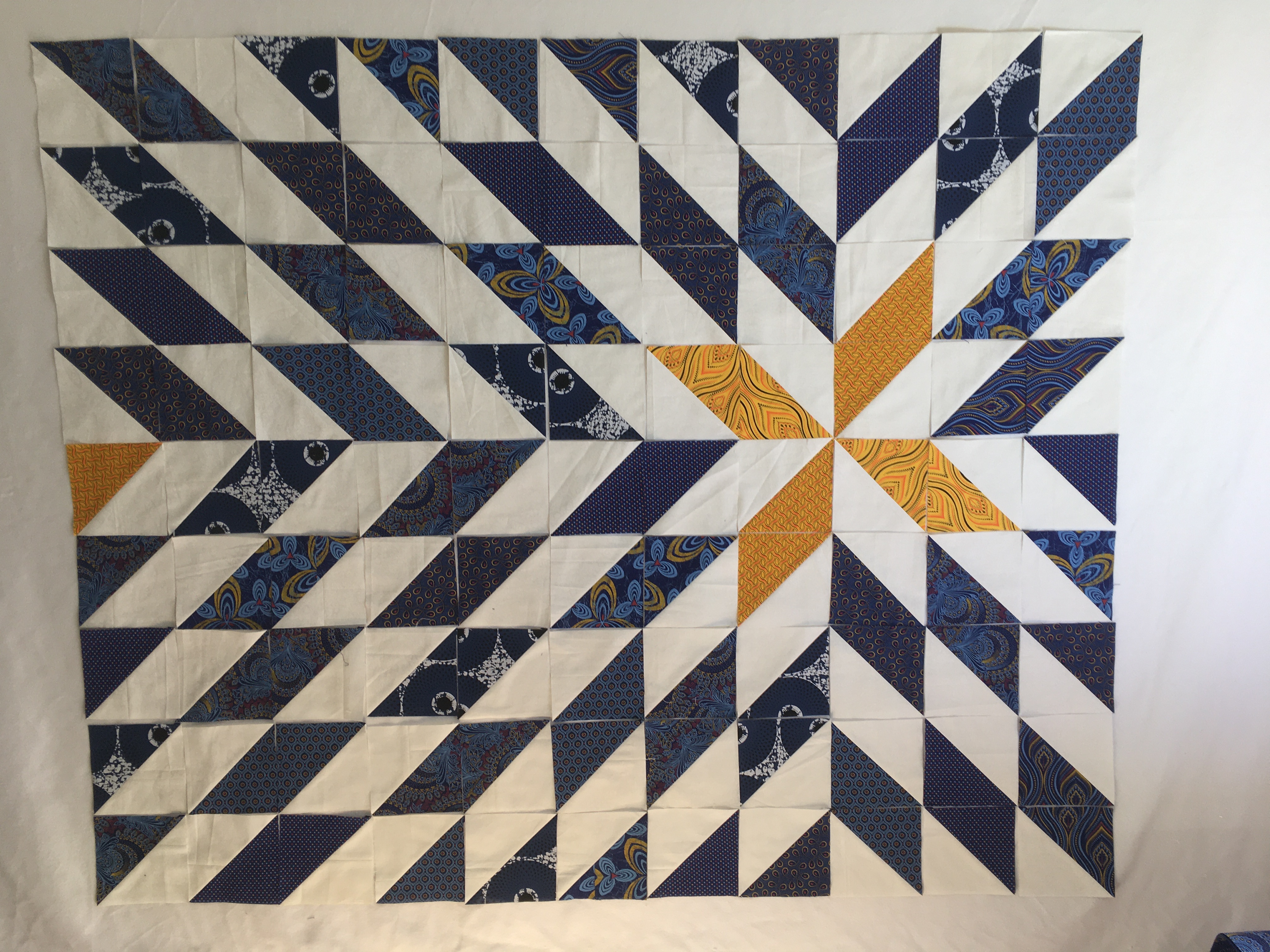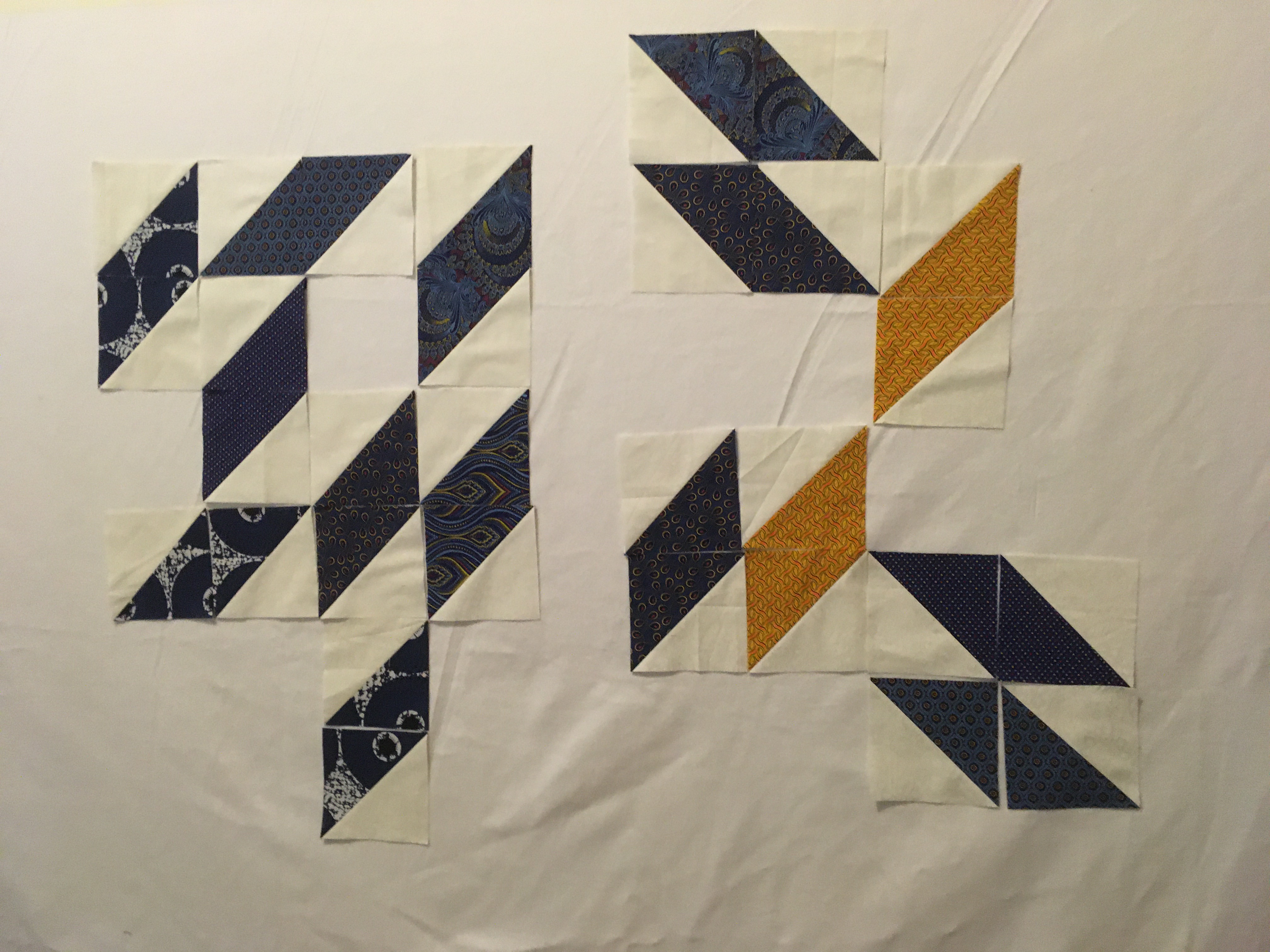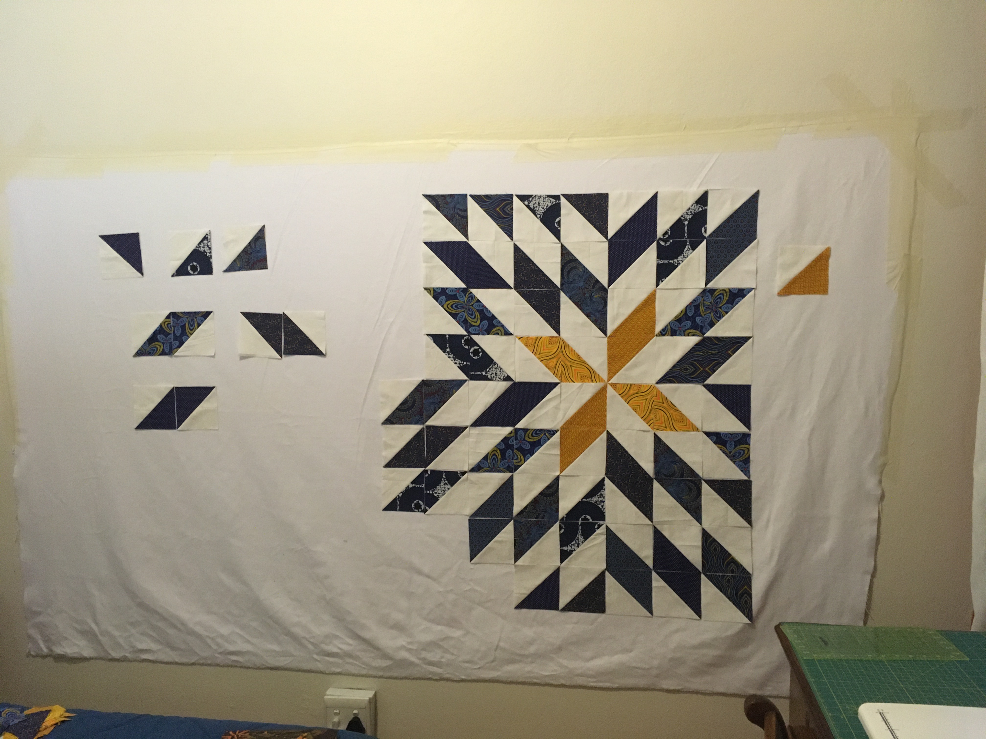 A friend from church had a baby a few months before COVID hit. Then lockdown happened and I had lots of time to make a baby blanket. I couldn’t go out and buy fabric, so I texted her some color palette options from my stash and she chose this blue and gold shweshwe set. I then started playing around with designs. Since I’ve been on a half-square triangle (HST) kick, I went ahead and made stacks of squares and started playing with combinations on my design wall.