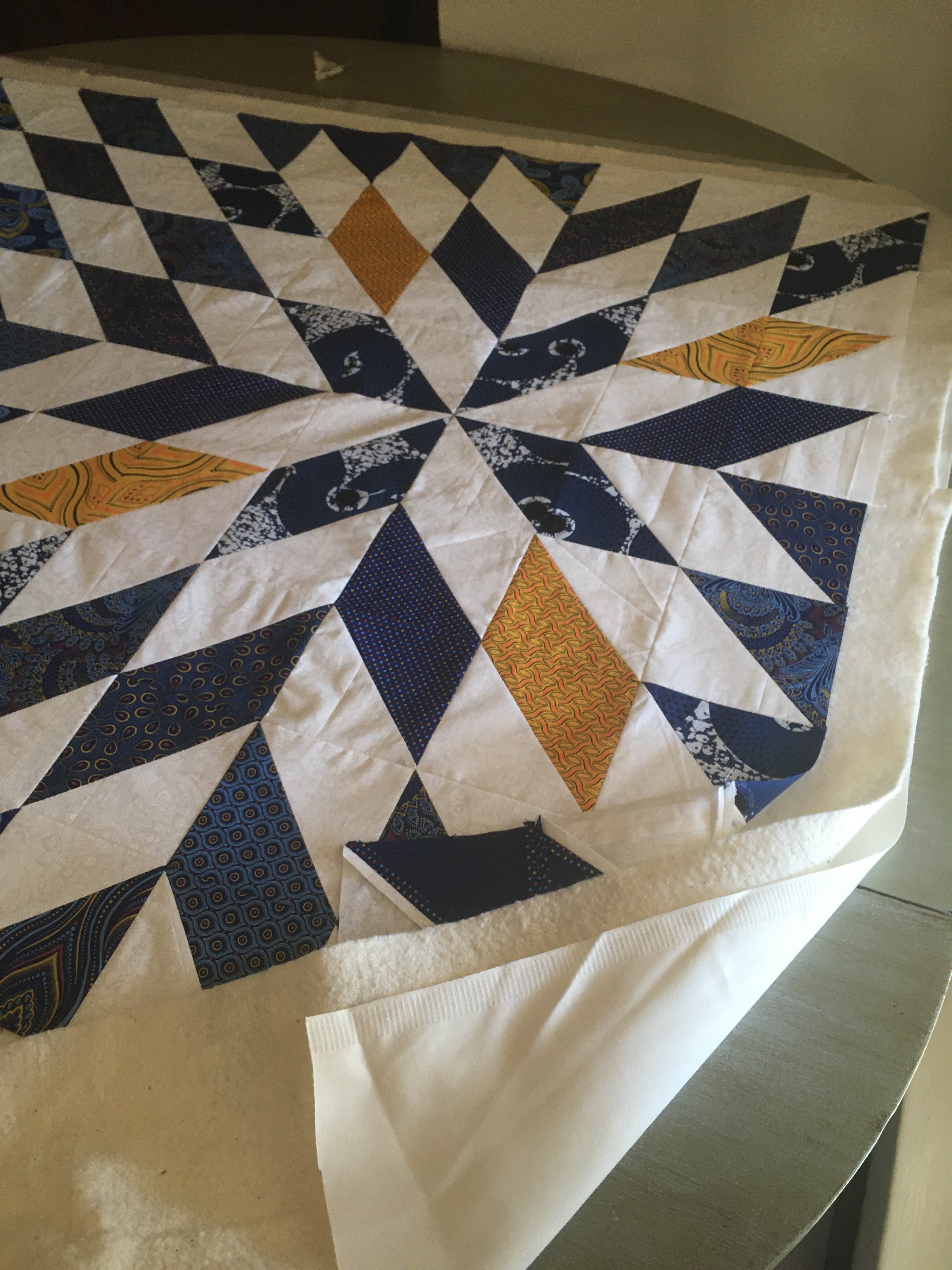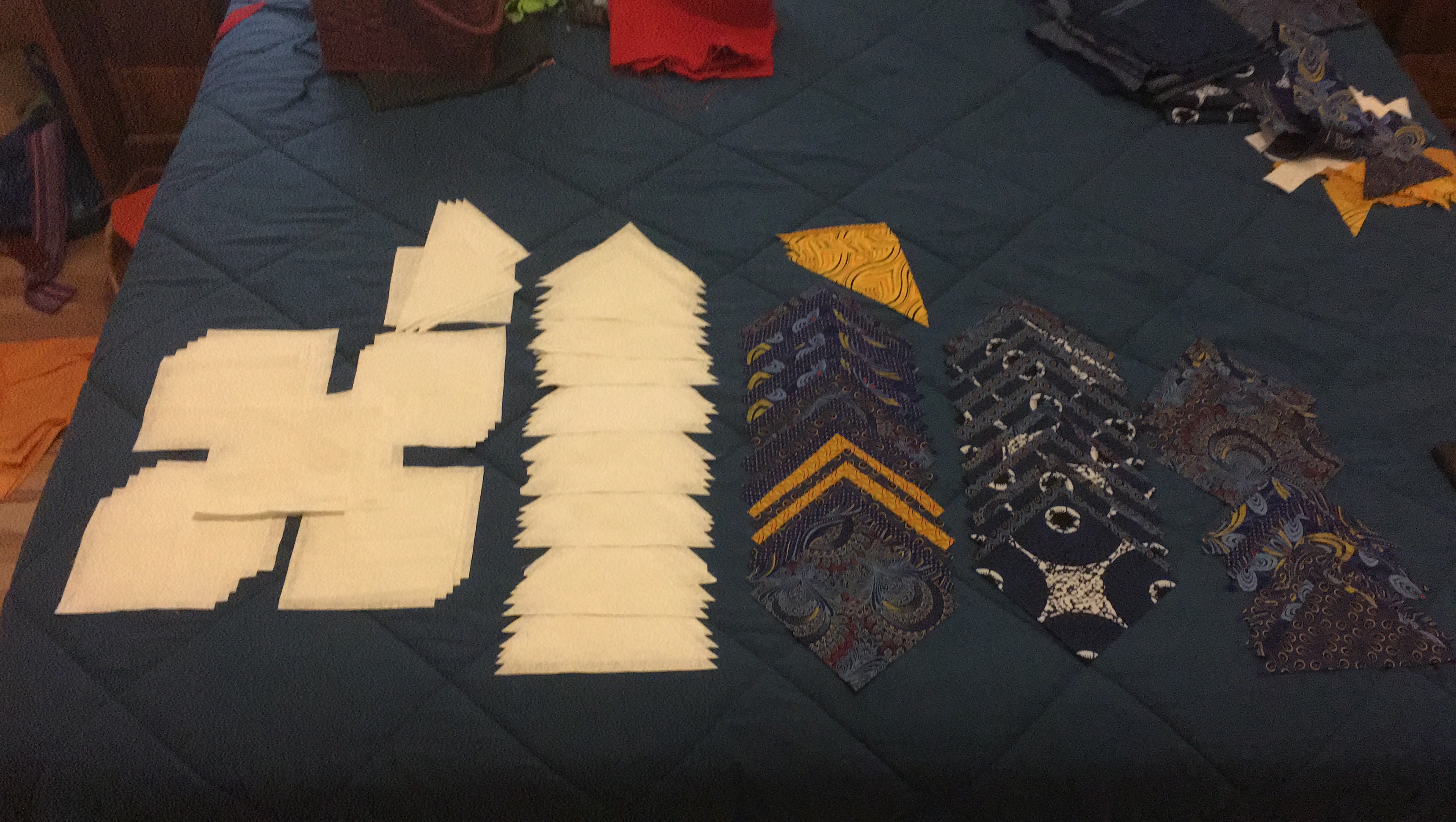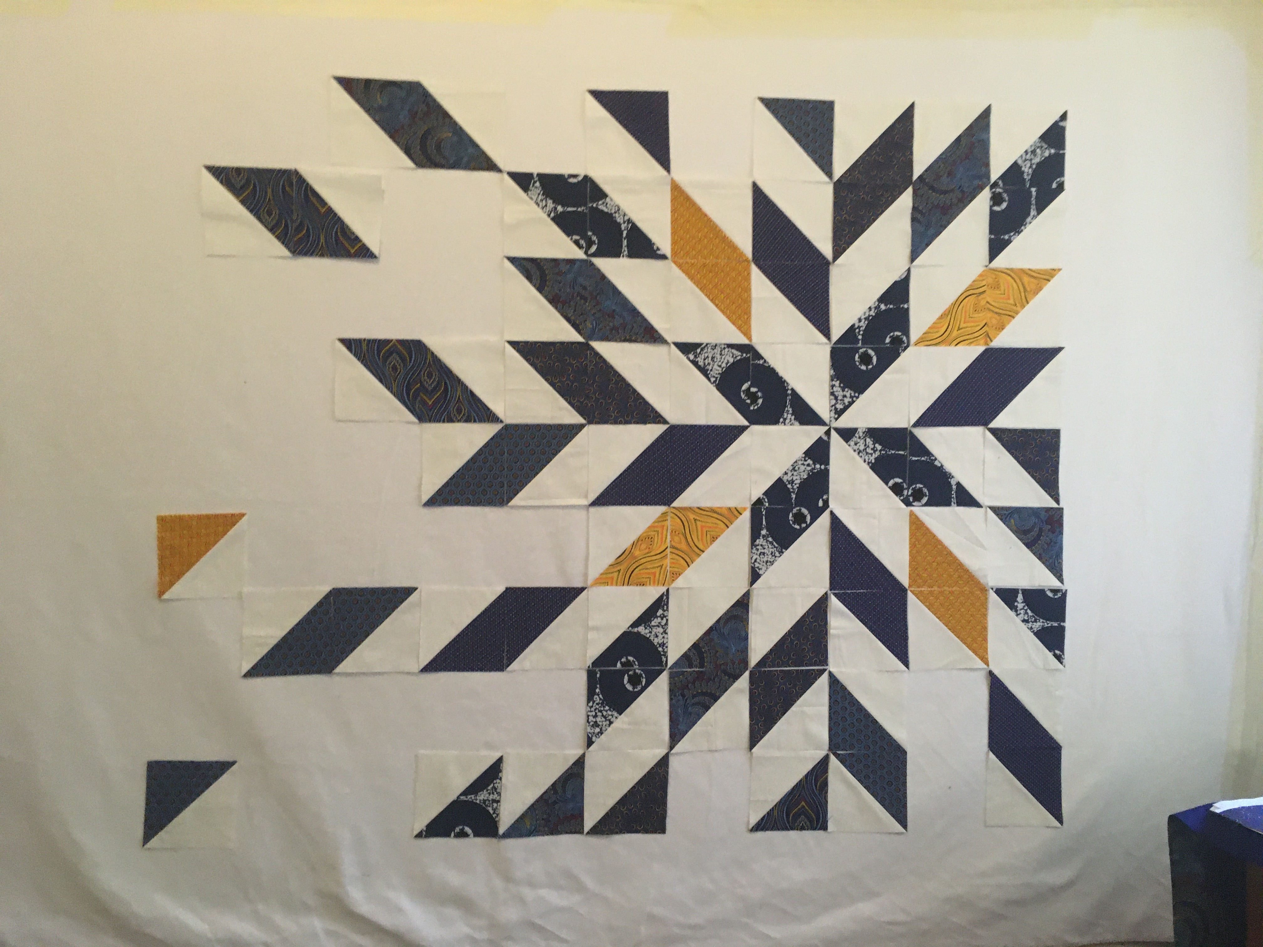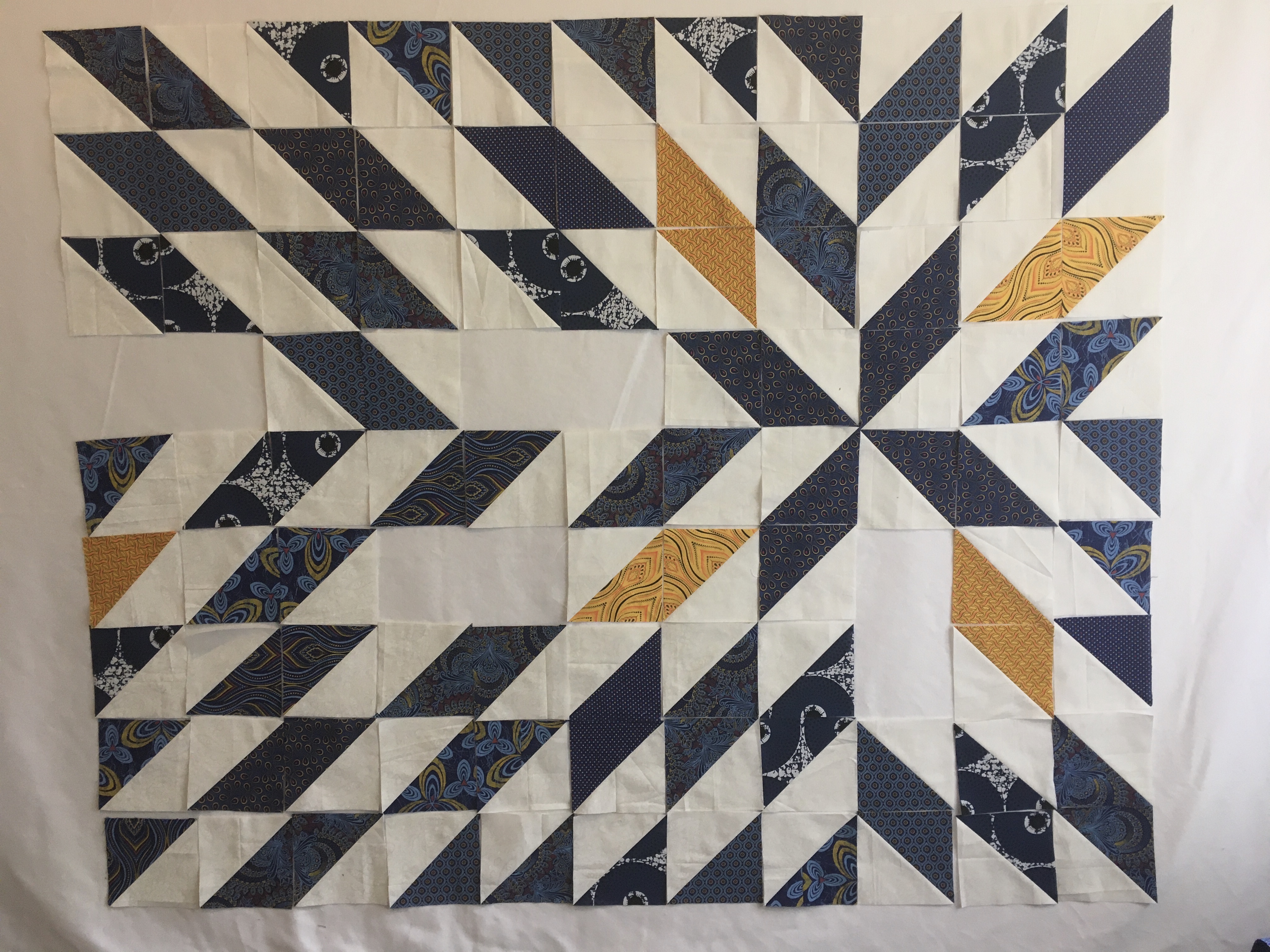 A friend from church had a baby a few months before COVID hit. Then lockdown happened and I had lots of time to make a baby blanket. I couldn’t go out and buy fabric, so I texted her some color palette options from my stash and she chose this blue and gold shweshwe set. I then started playing around with designs. Since I’ve been on a half-square triangle (HST) kick, I went ahead and made stacks of squares and started playing with combinations on my design wall.