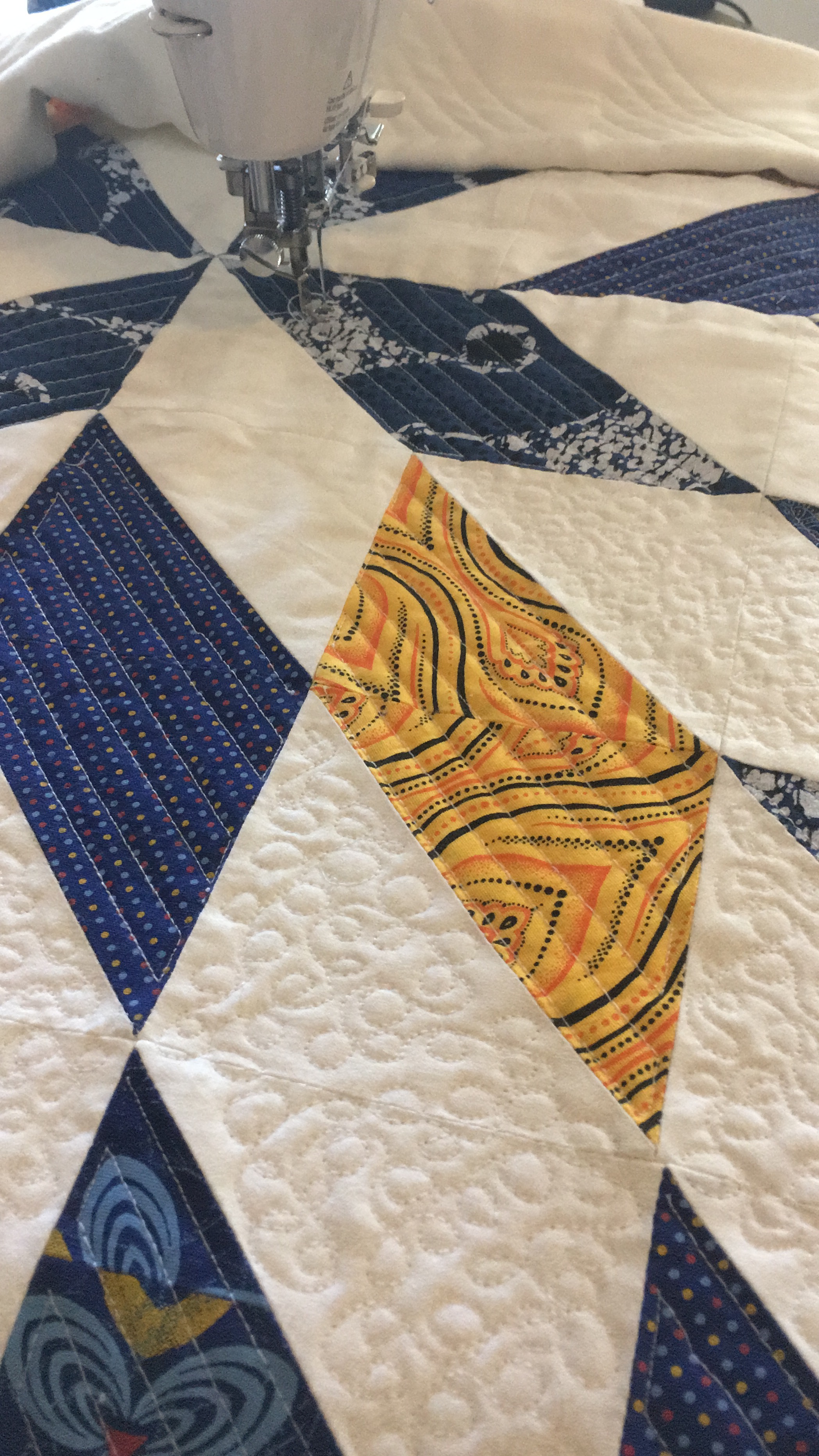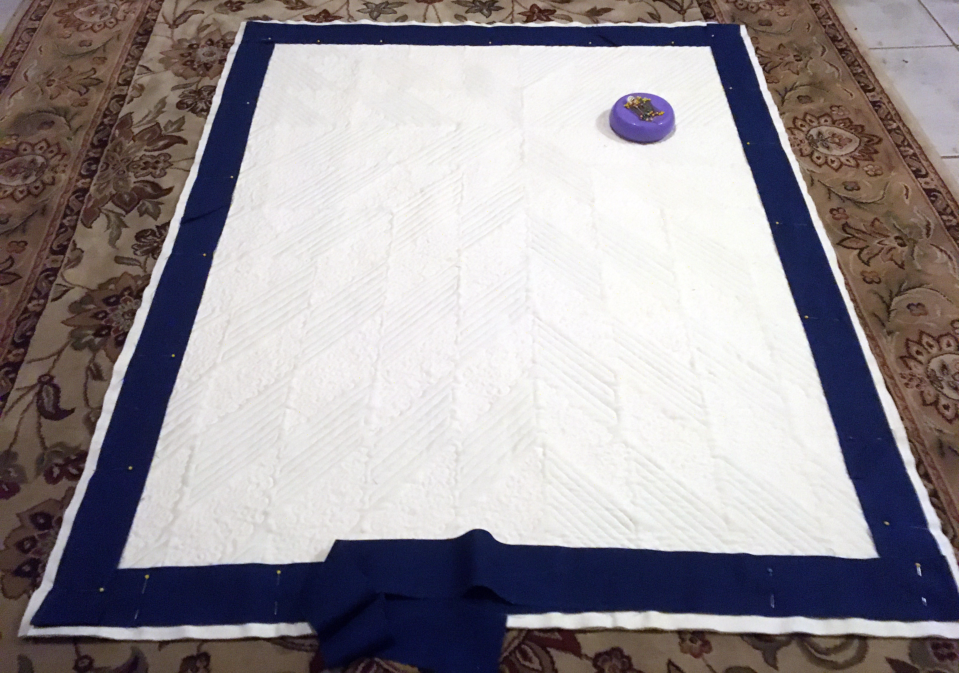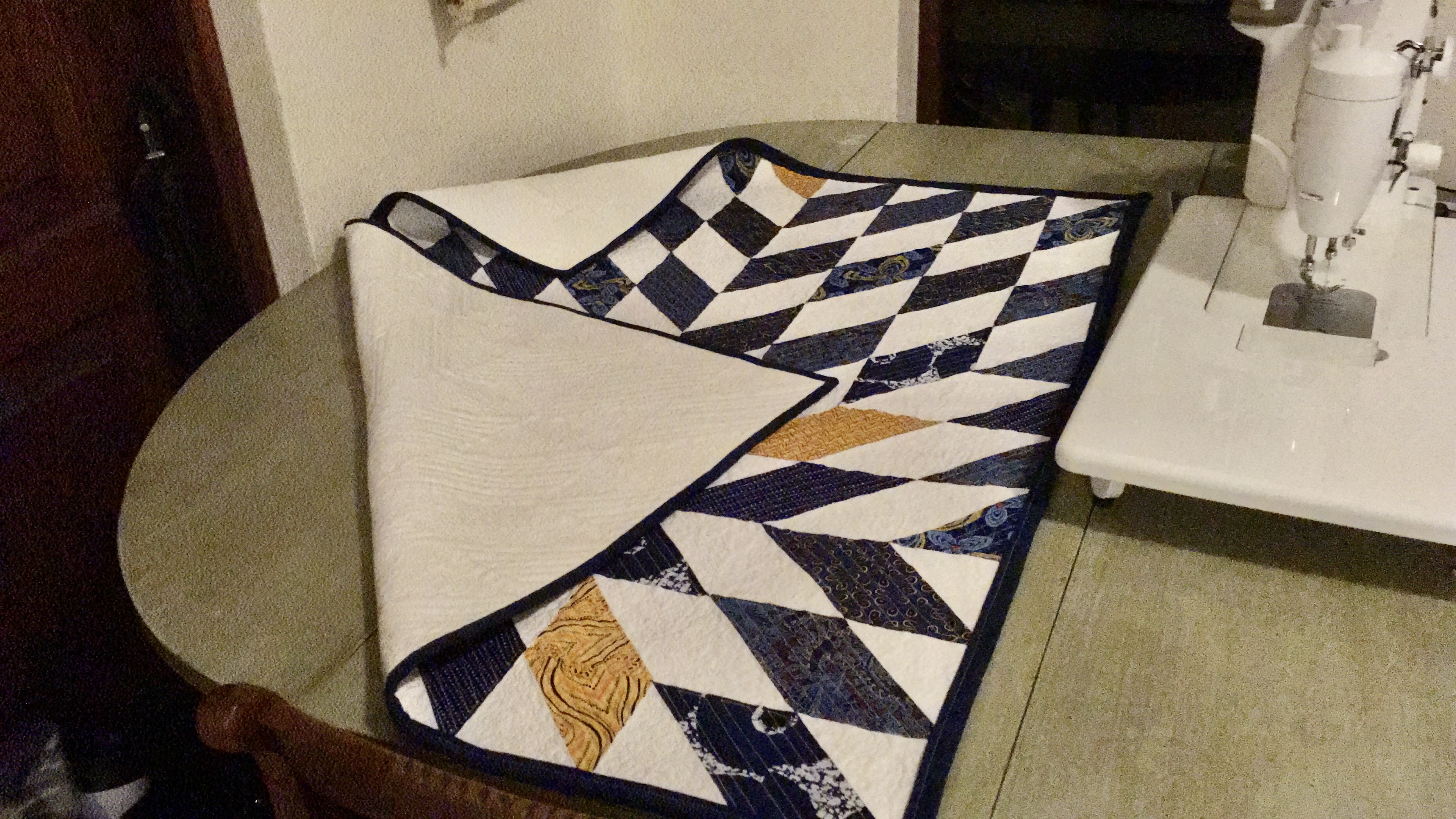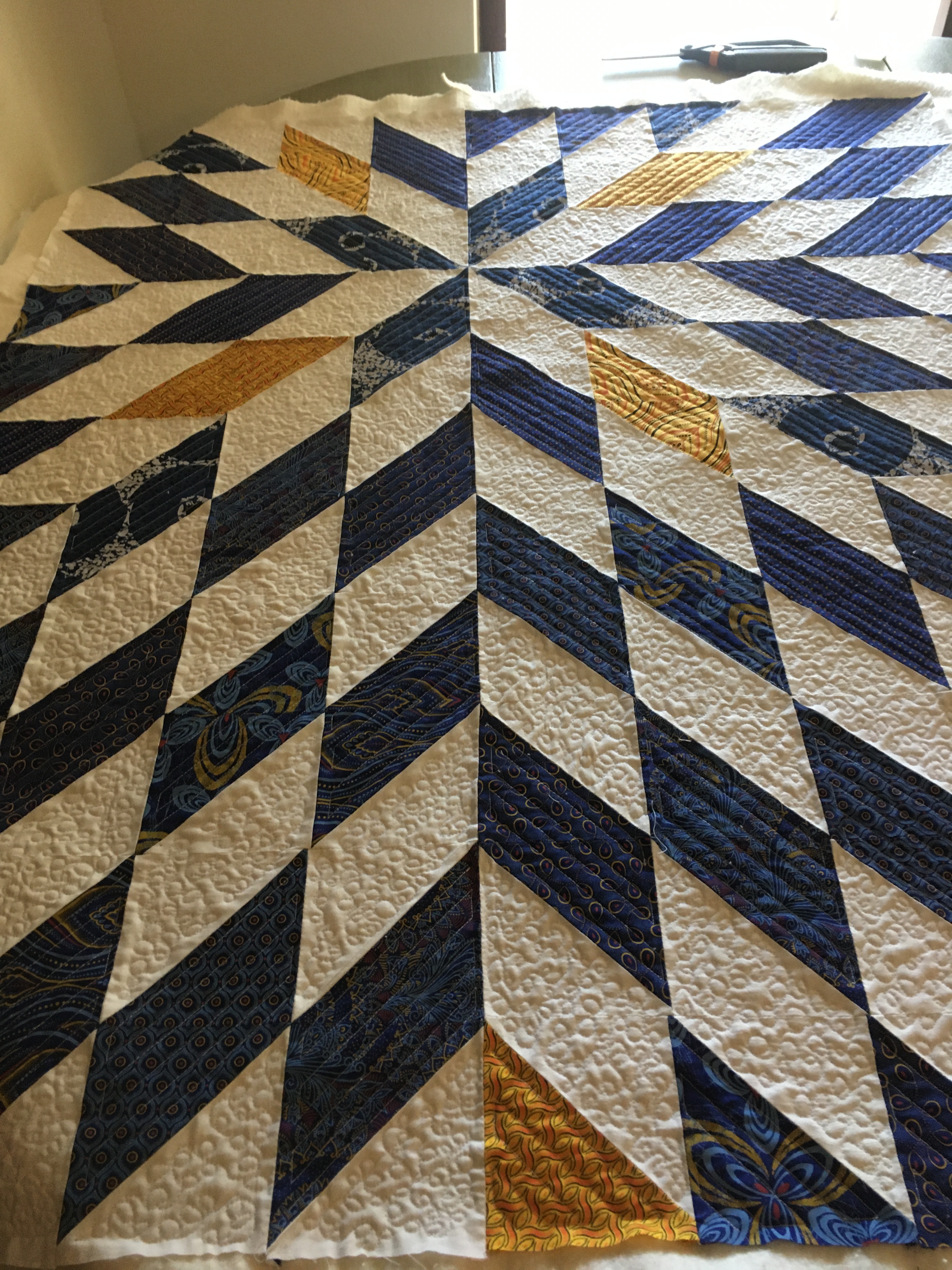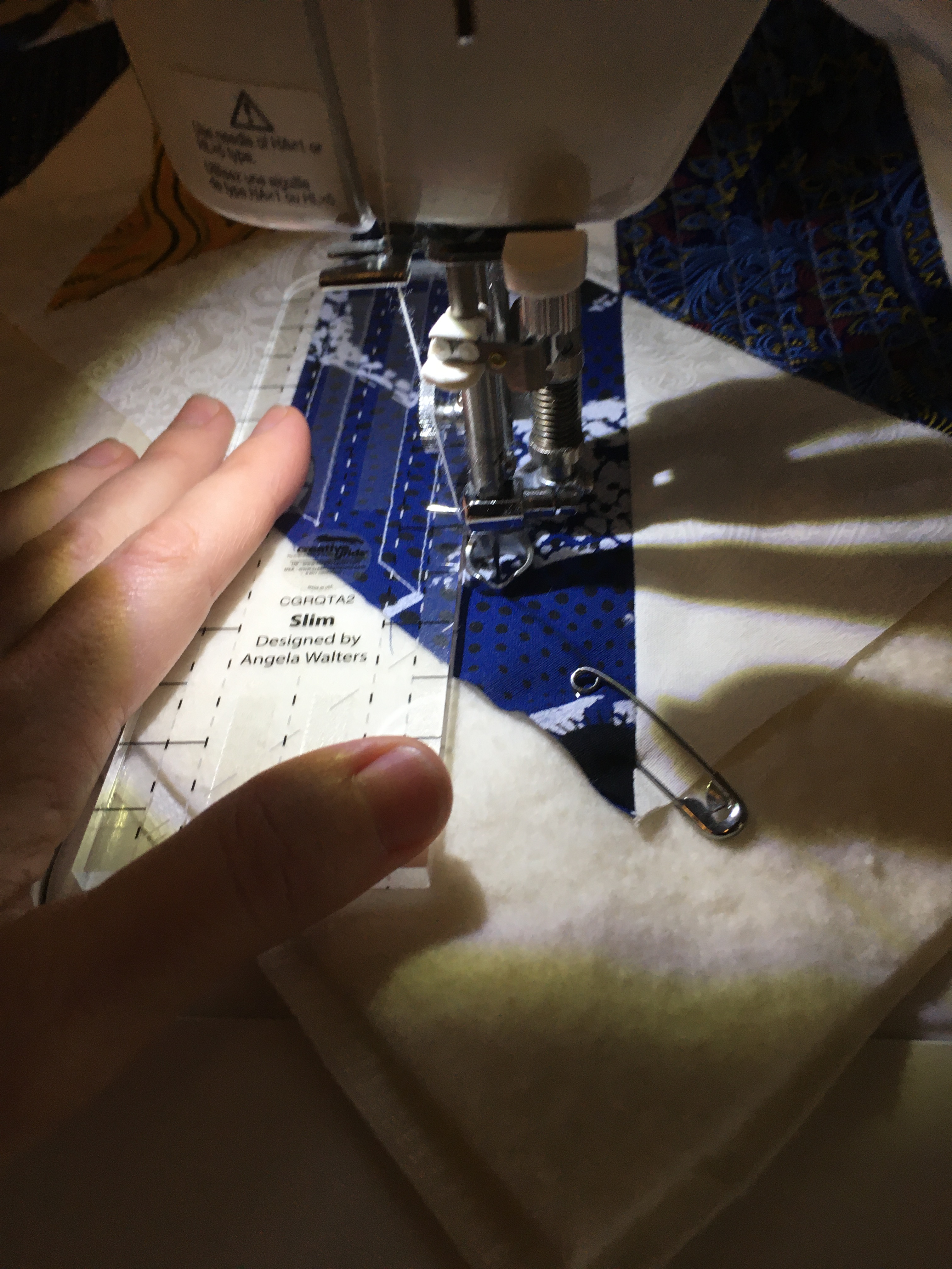 There was a lot of square shifting … but once I finally settled on an arrangement, I stitched the front together and tried to figure out how to quilt it. I wanted to try my new ruler but was nervous because it was another new technique. In the end, I alternated squiggles with straight lines, and and just went for it. Not perfect, but a solid first effort.