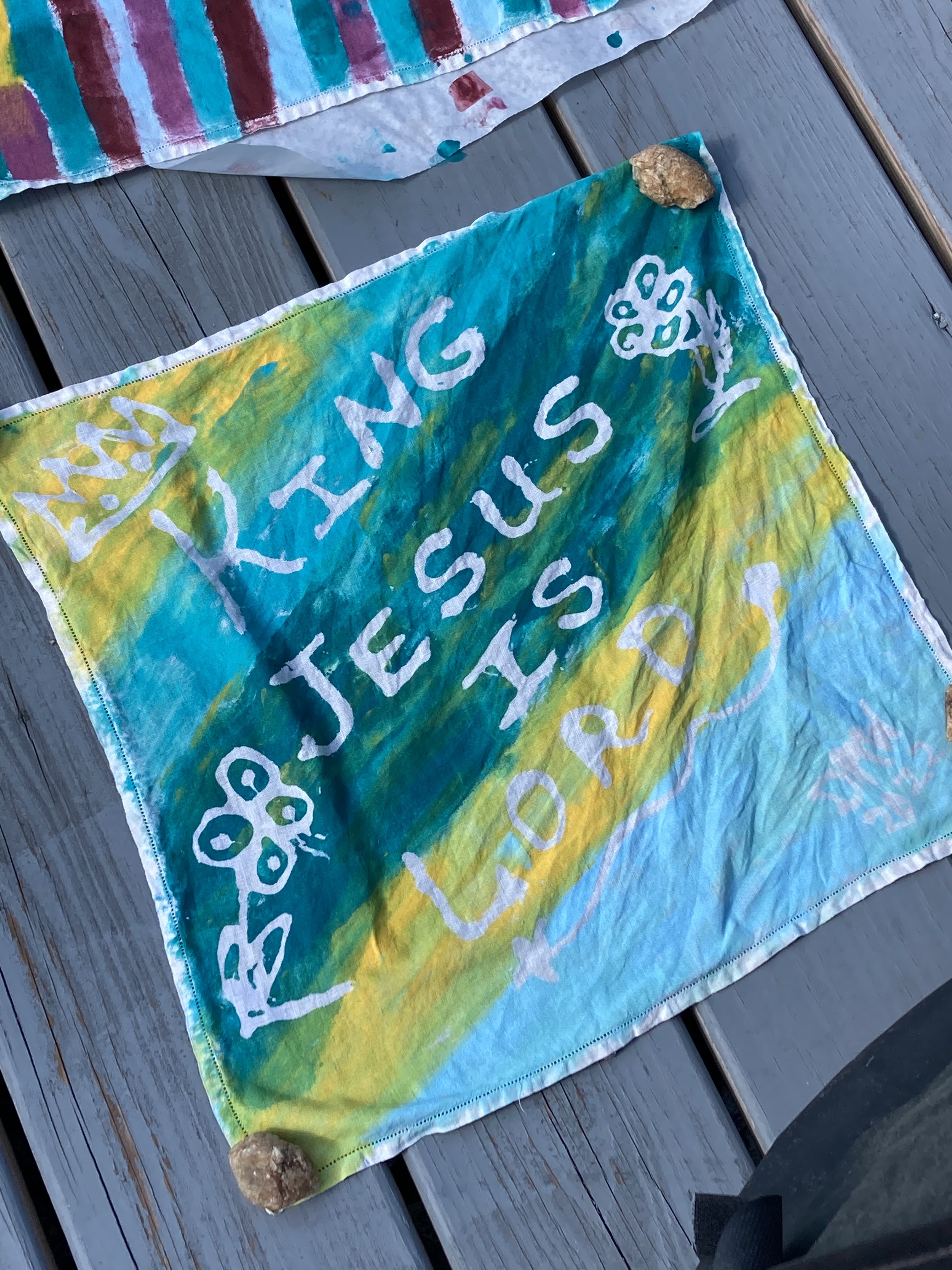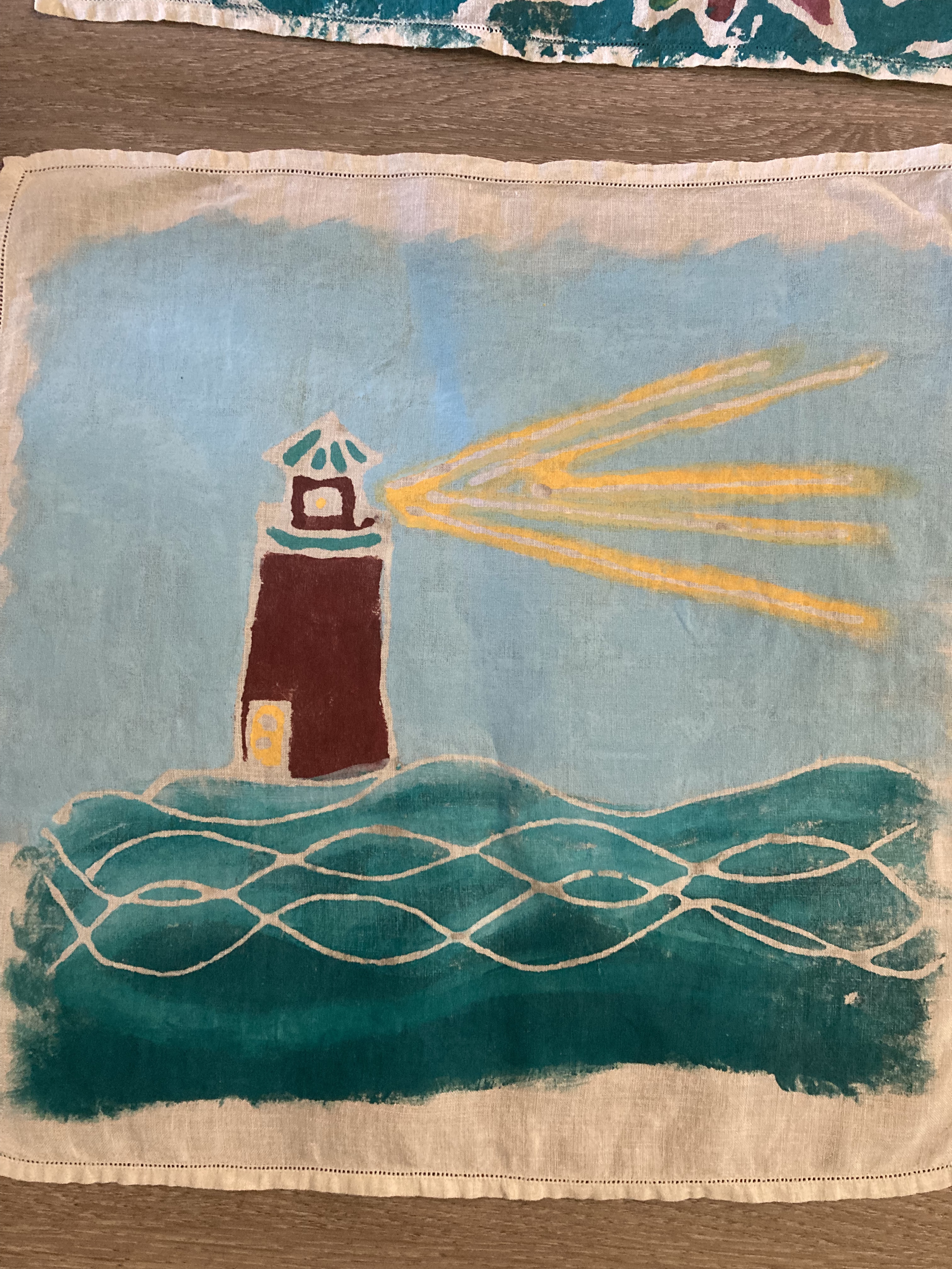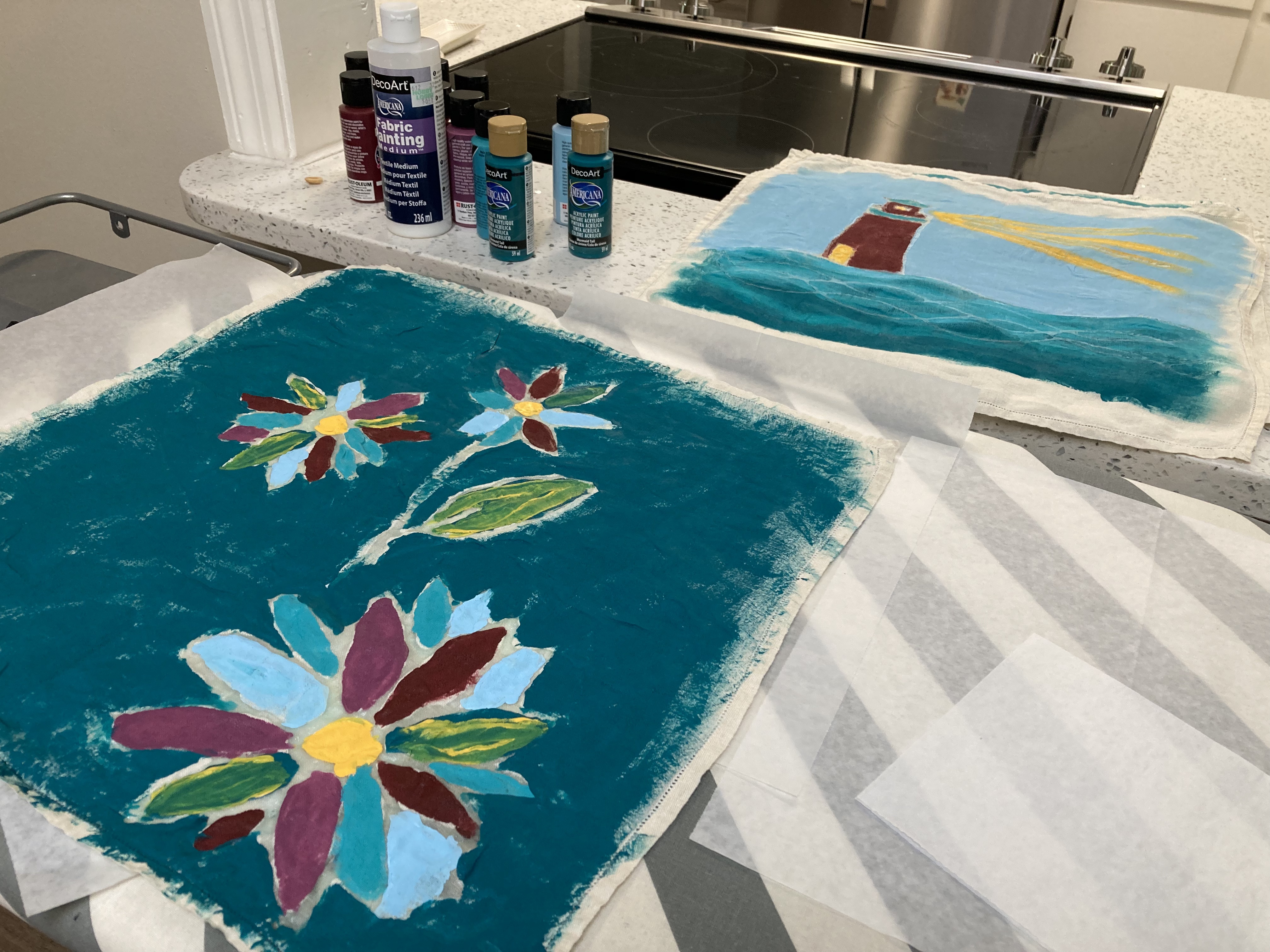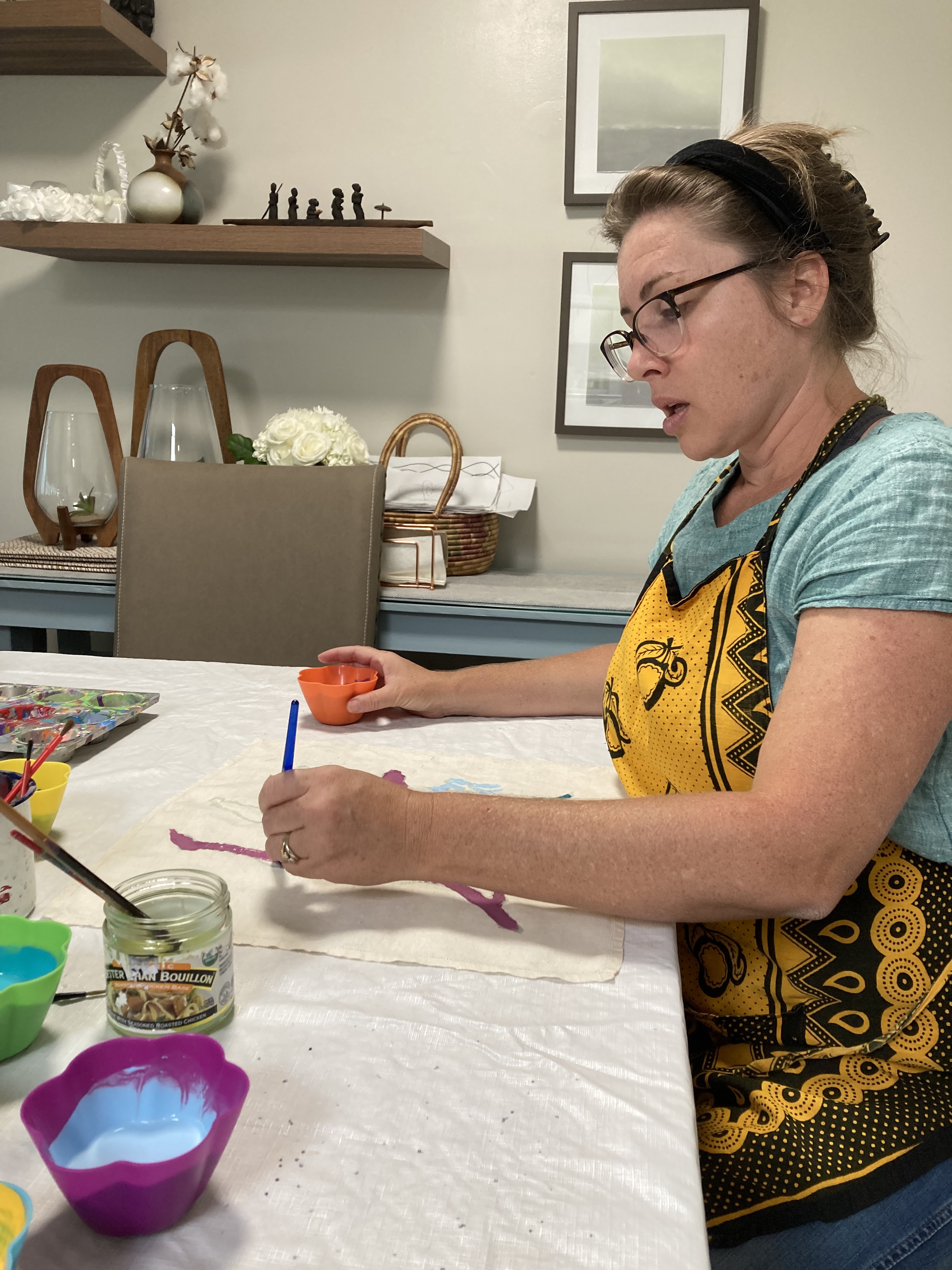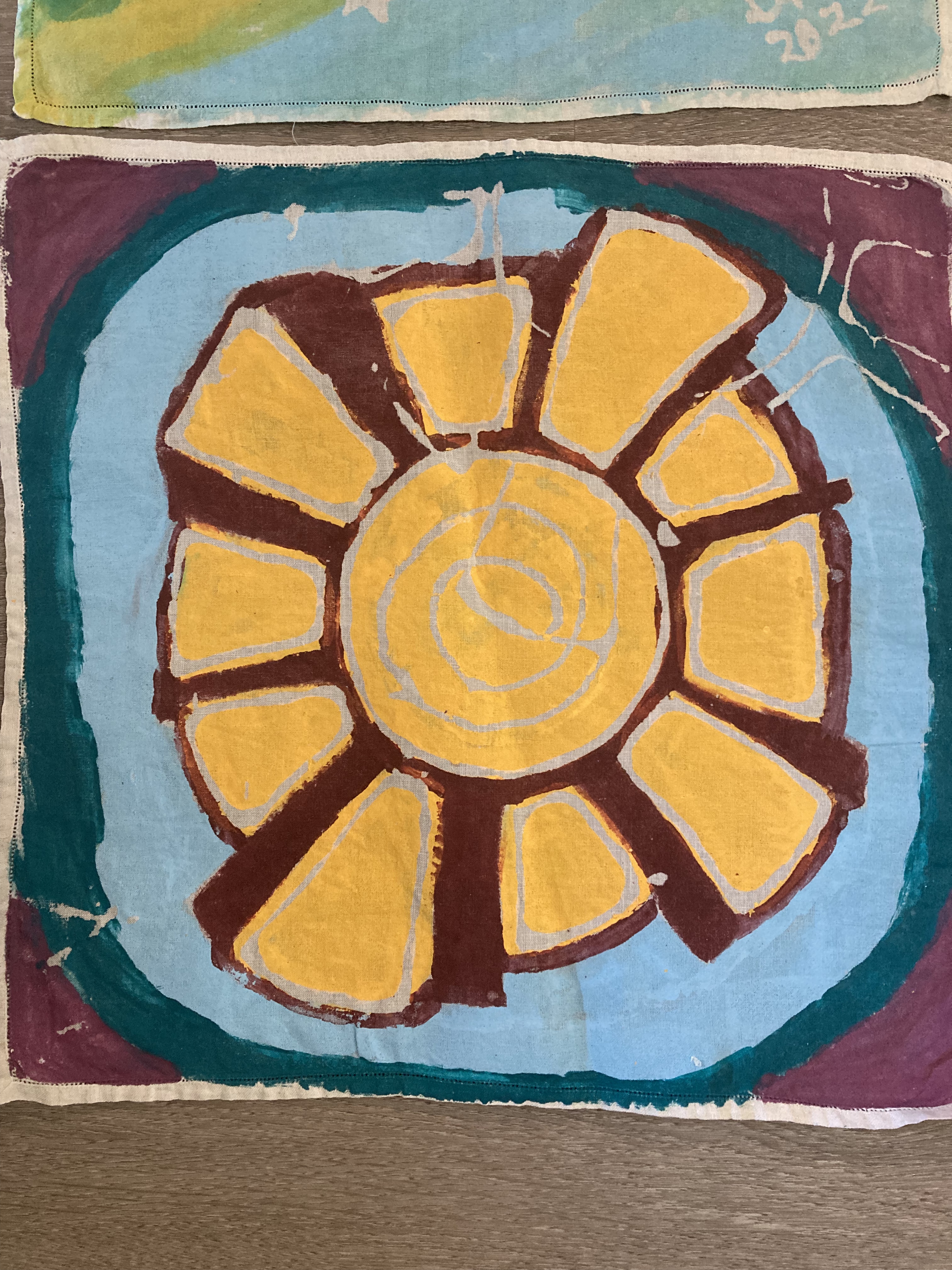 My mom, my aunt, two cousins, and three of their kids all participated in the resist-dye part of the project. Each person got a cloth square (old linen napkins) and some Elmer’s glue. We put our own design idea on the fabric square using the glue. Once it had dried, we brushed fabric paint onto the rest of the square. Once all THAT had dried, we used warm water to remove the glue (and the parchment paper that had stuck to the back of the fabric … note: never again use parchment paper for this project.) It took a full day and then some to finish this first step of the project, but we had a good time together.