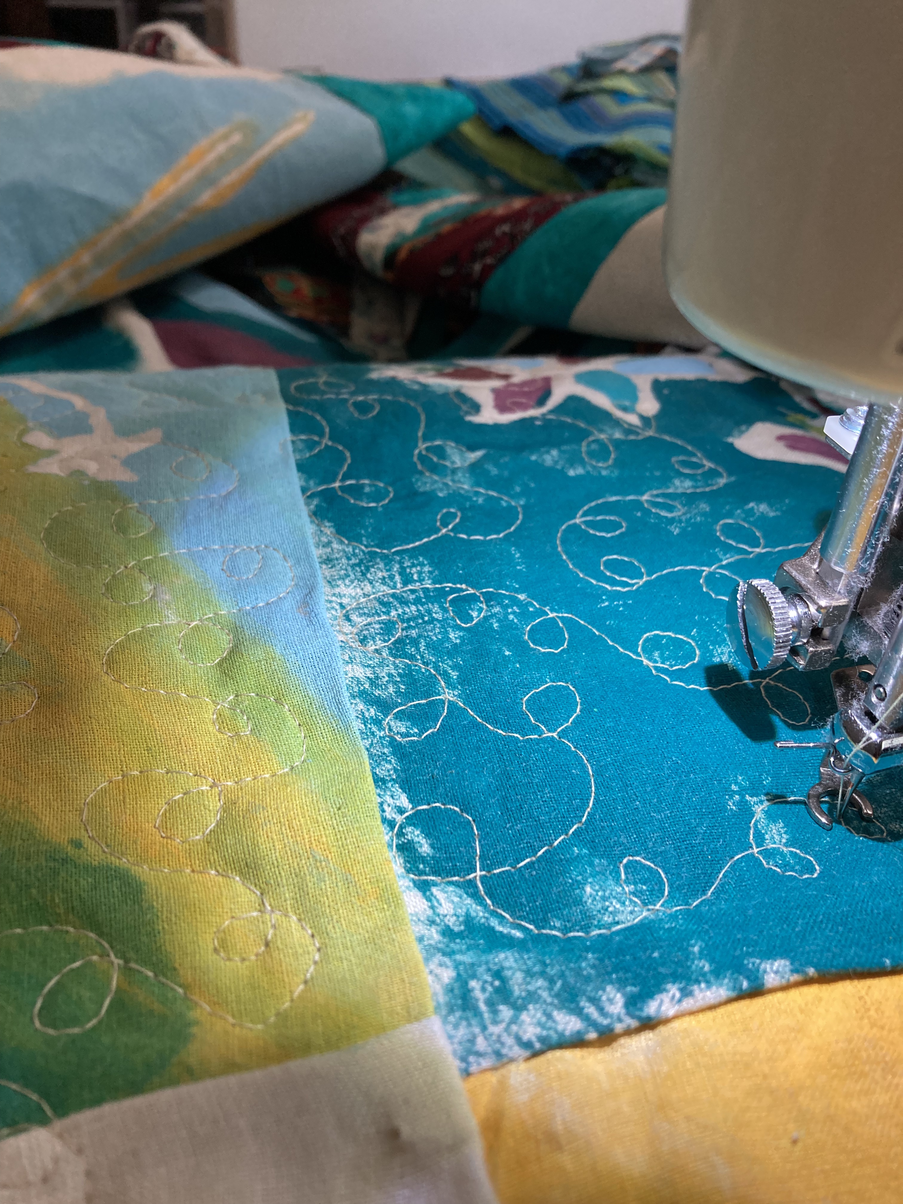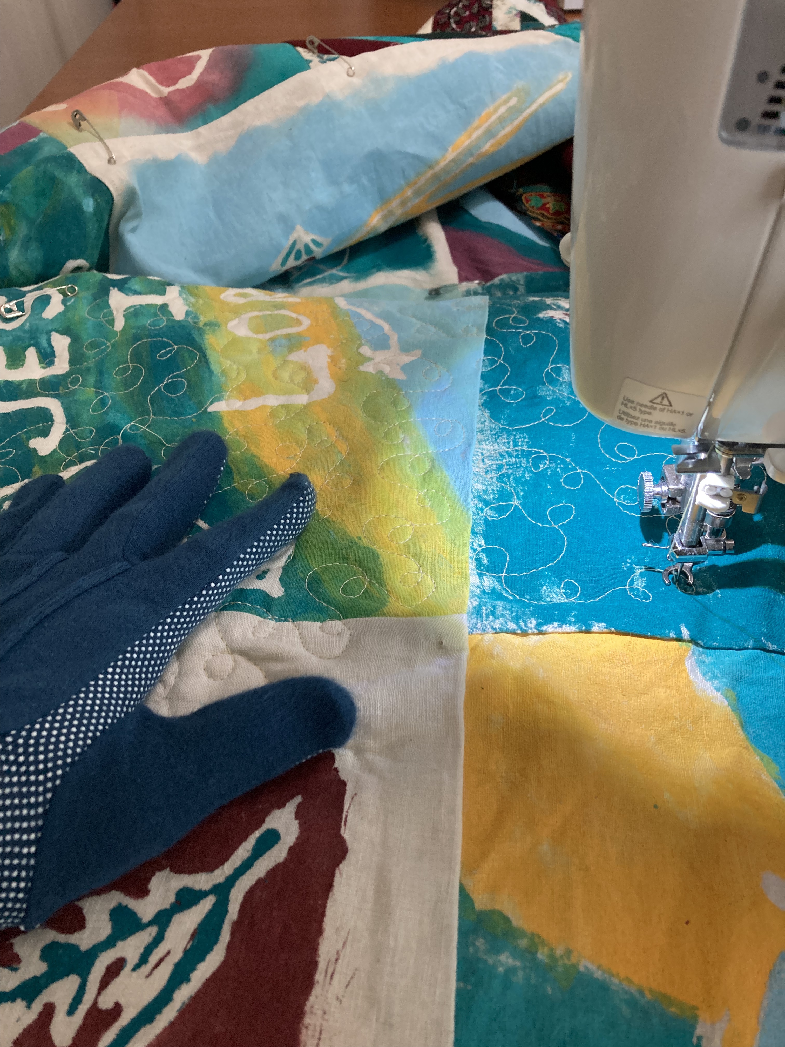 Piecing the other side (the more traditional quilt side) and quilting the whole thing together took me about a week with some very late nights along the way. I was on a deadline — I needed to finish before I flew to CA in July to see my new niece.