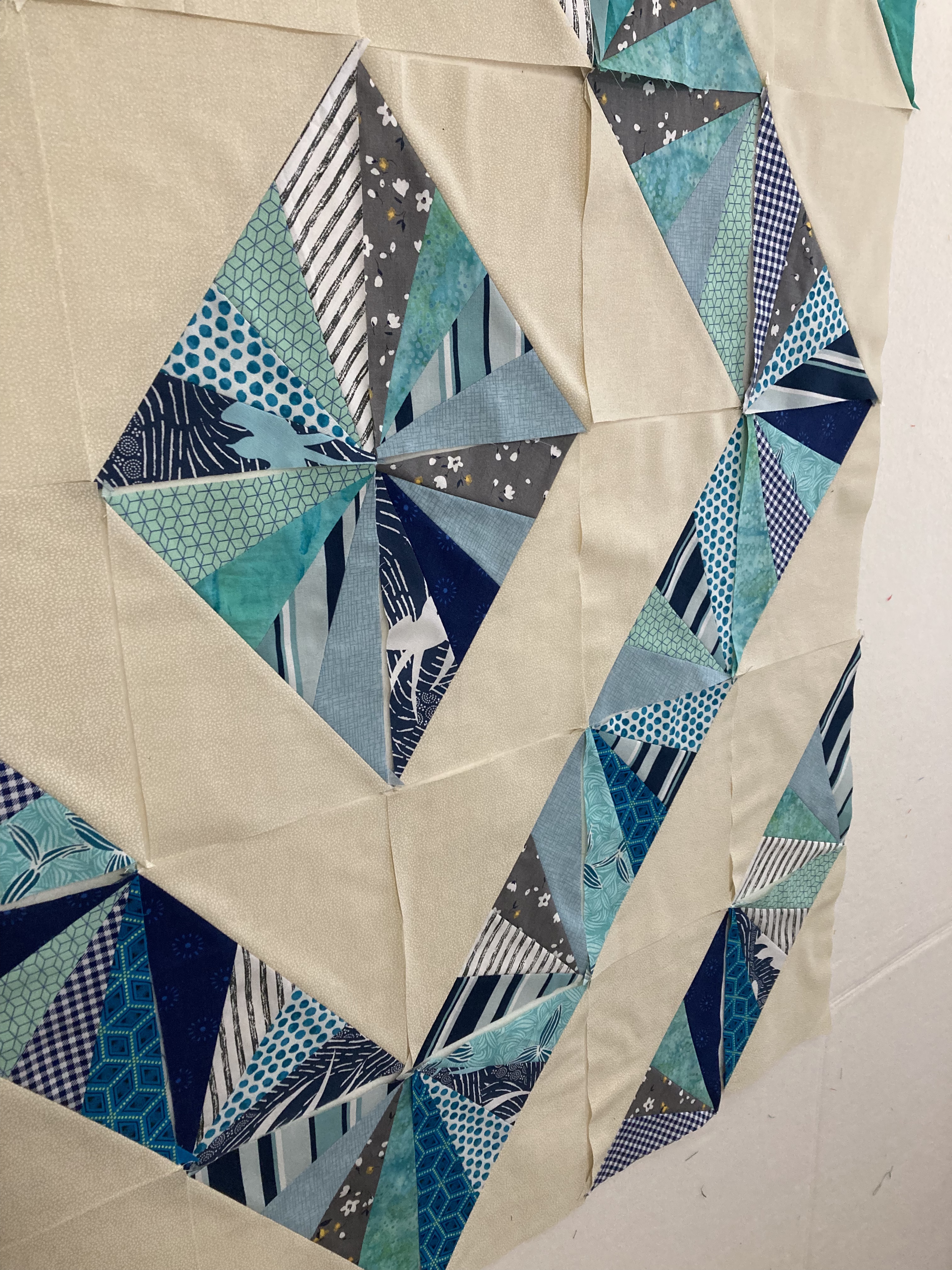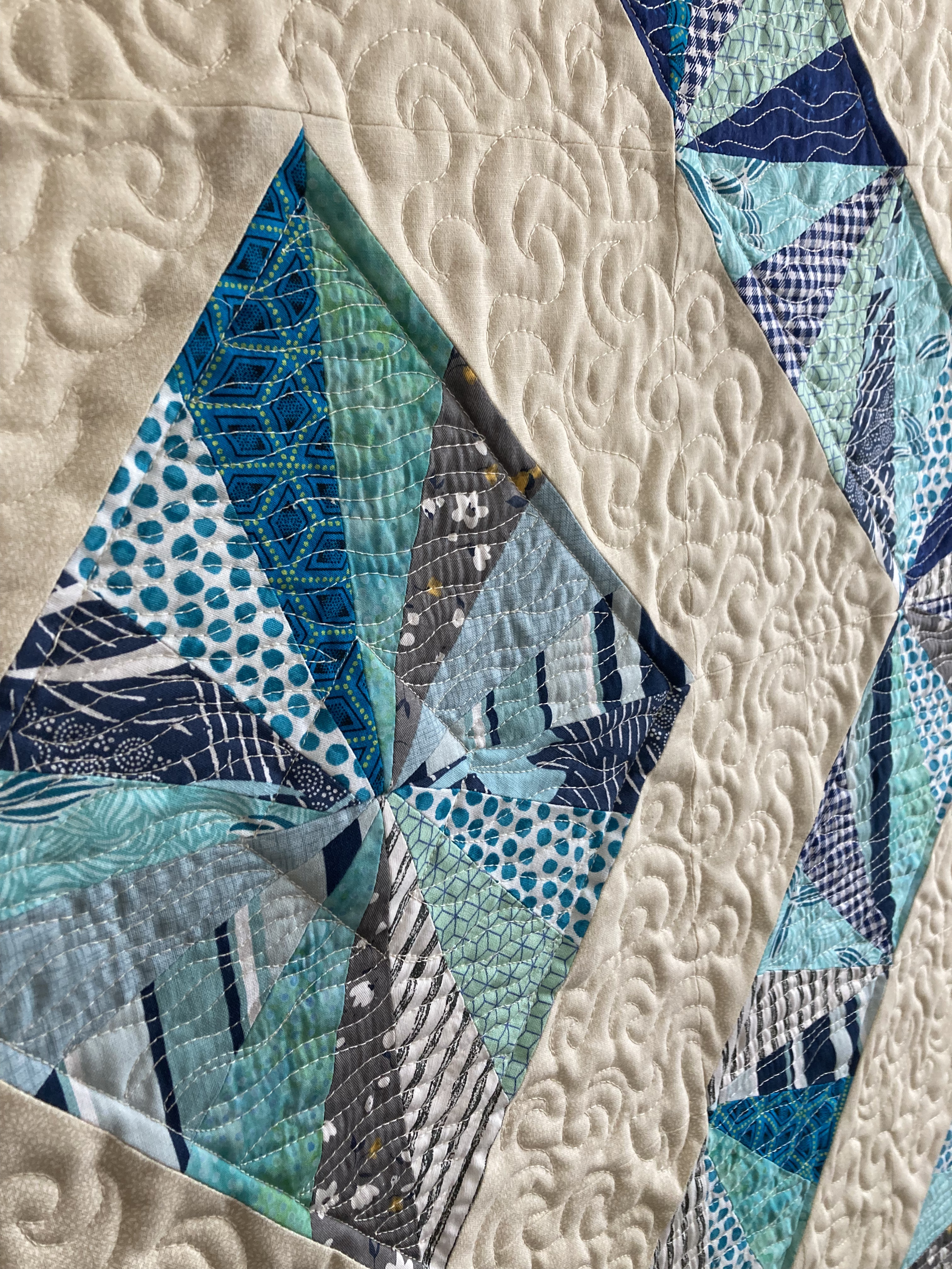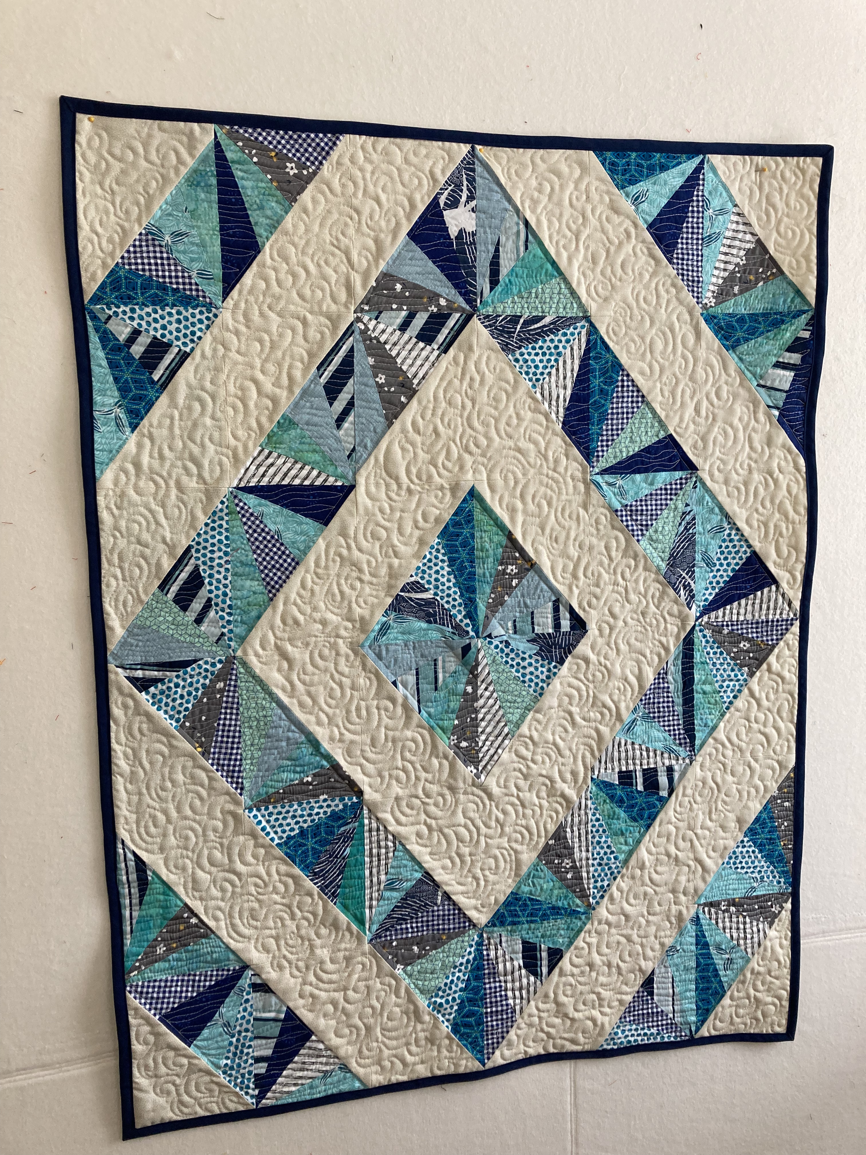 Another friend recently had a baby so I threw together this little crib blanket. I was playing around with a variation of the half-square triangle pattern using scraps from the 2nd quilting bee project. I think it looks a little like shattered glass and I like it.