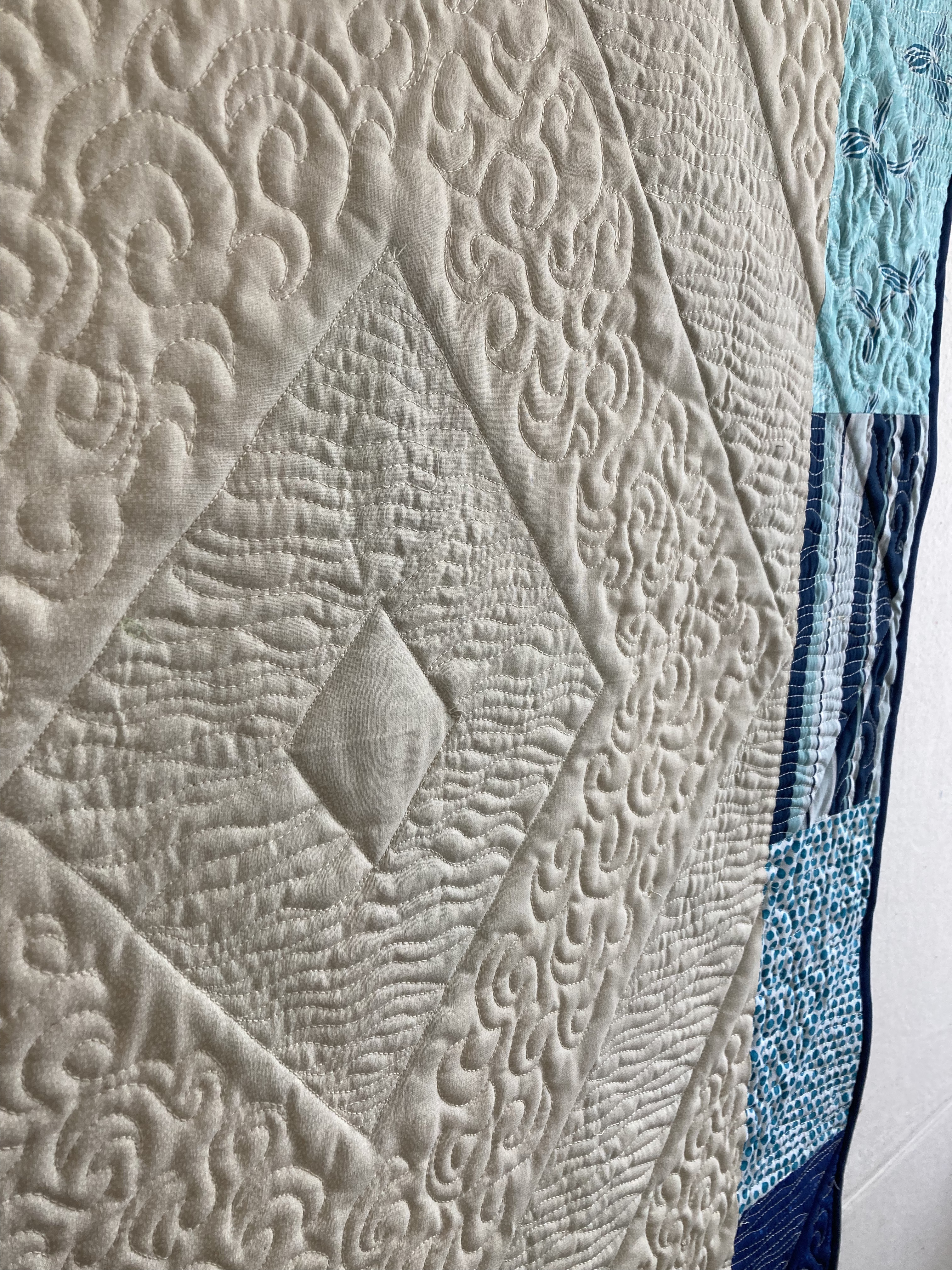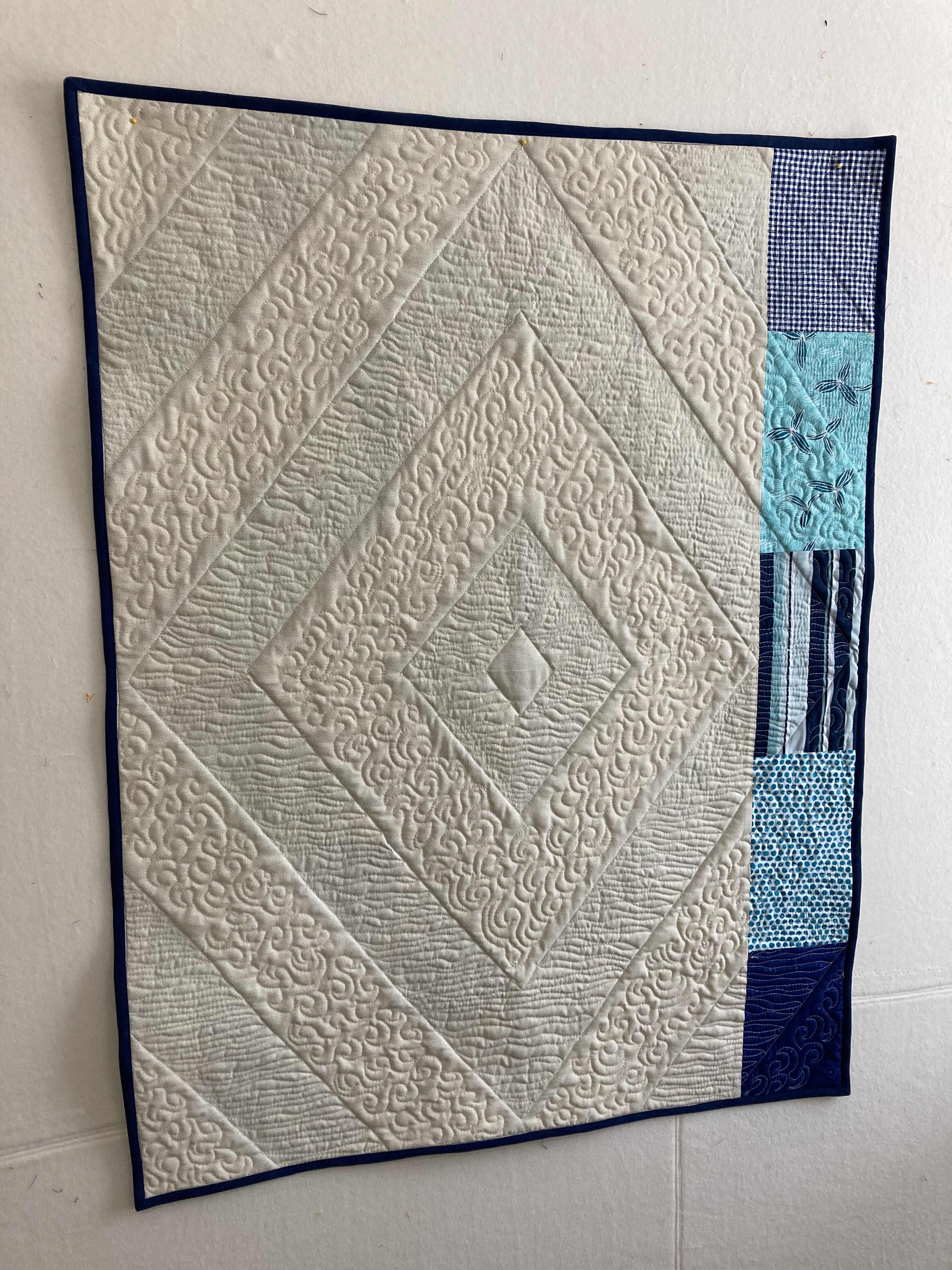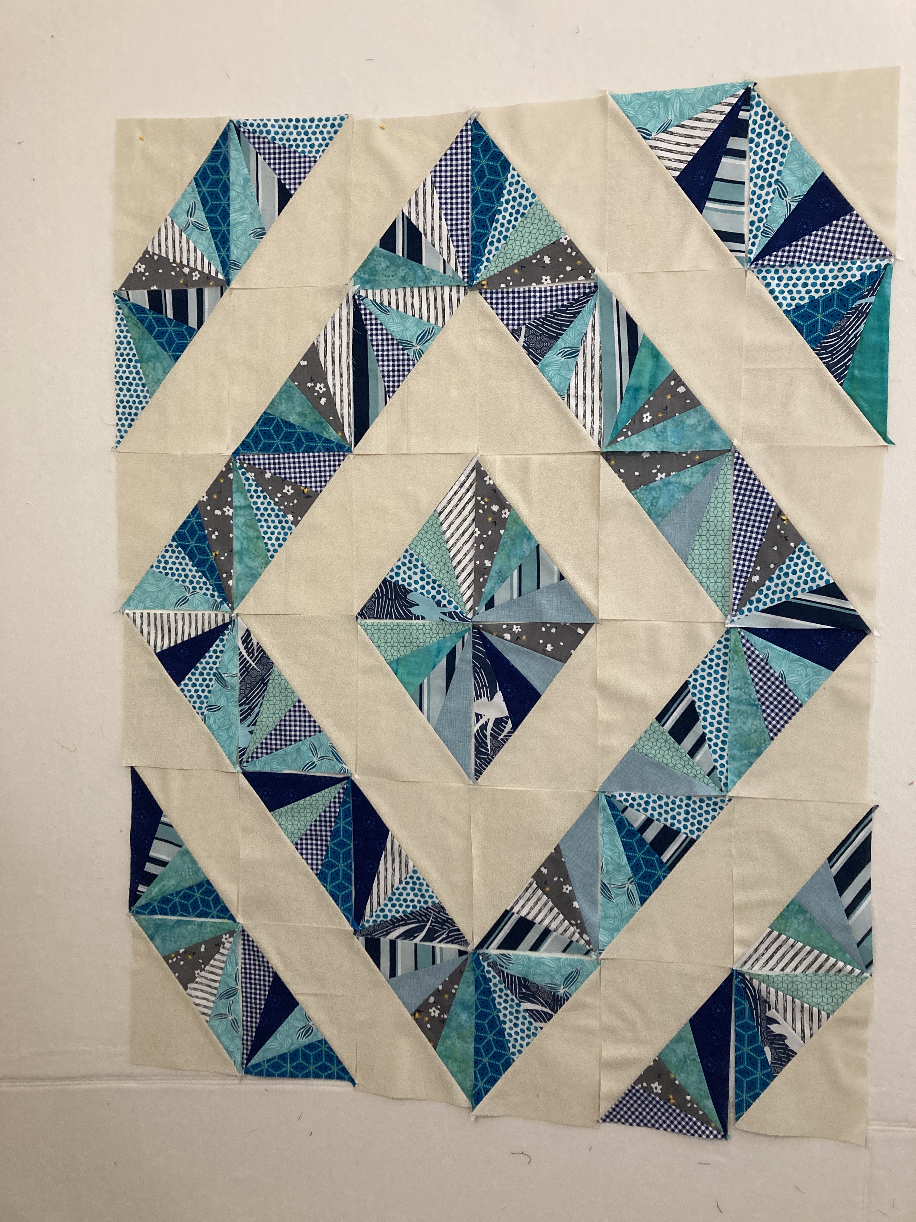 Another friend recently had a baby so I threw together this little crib blanket. I was playing around with a variation of the half-square triangle pattern using scraps from the 2nd quilting bee project. I think it looks a little like shattered glass and I like it.
