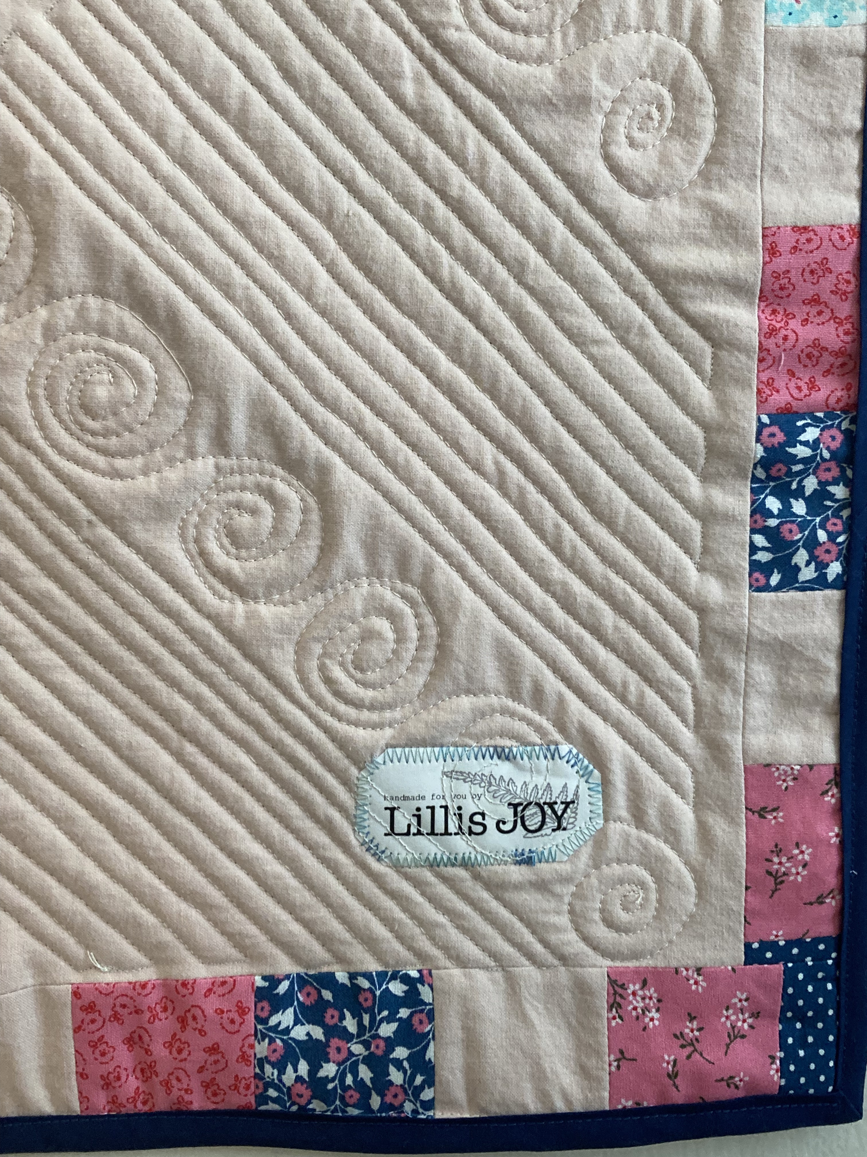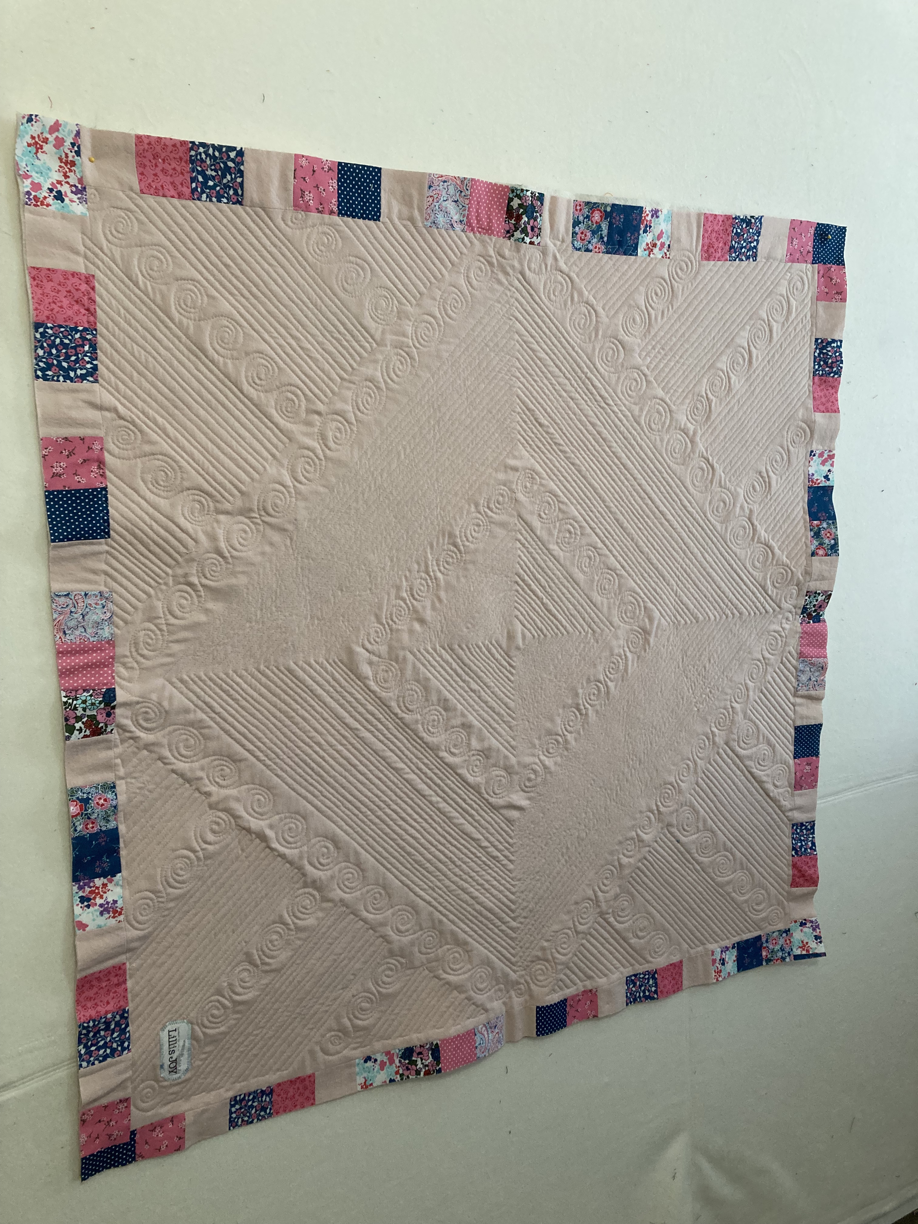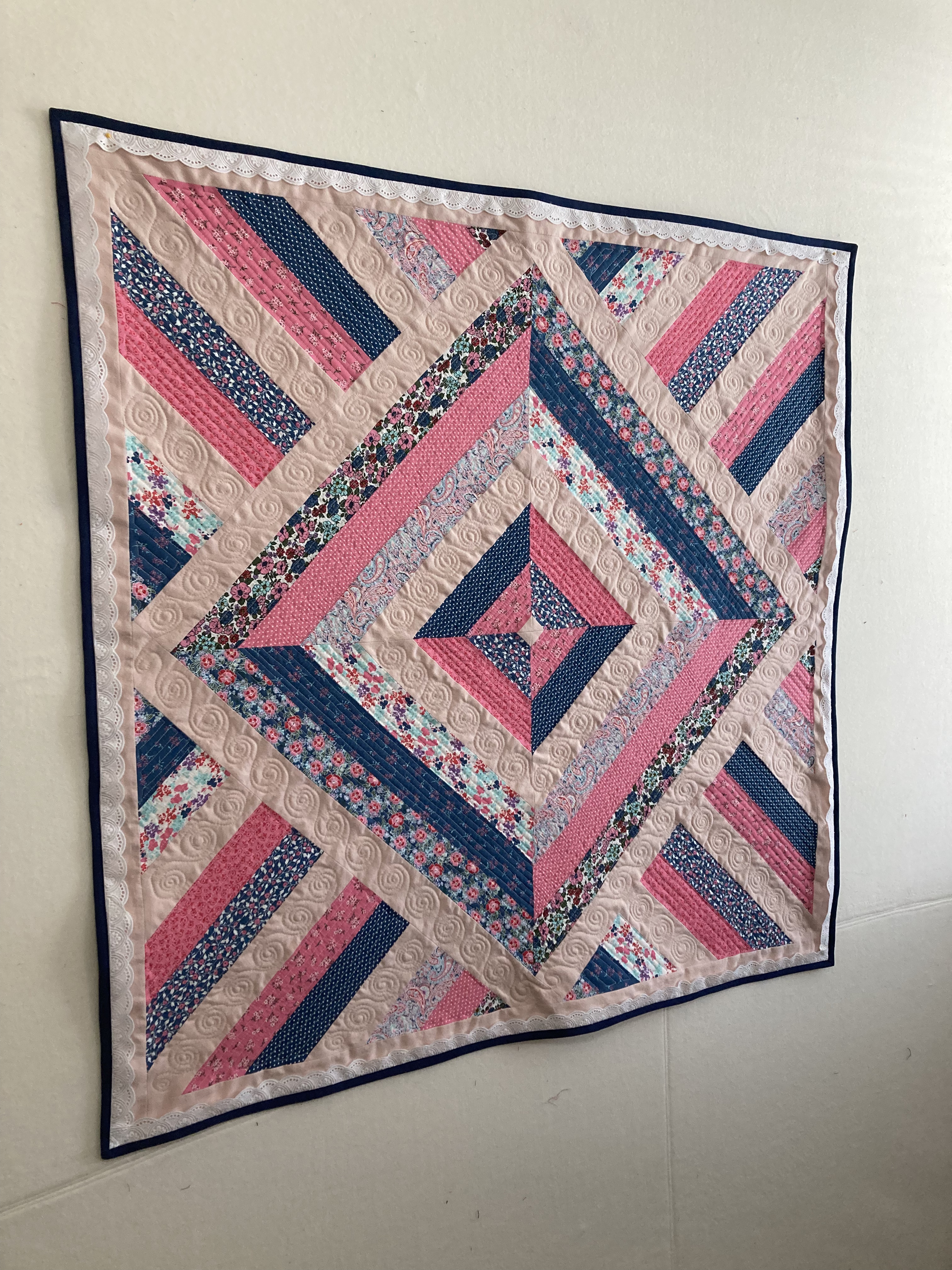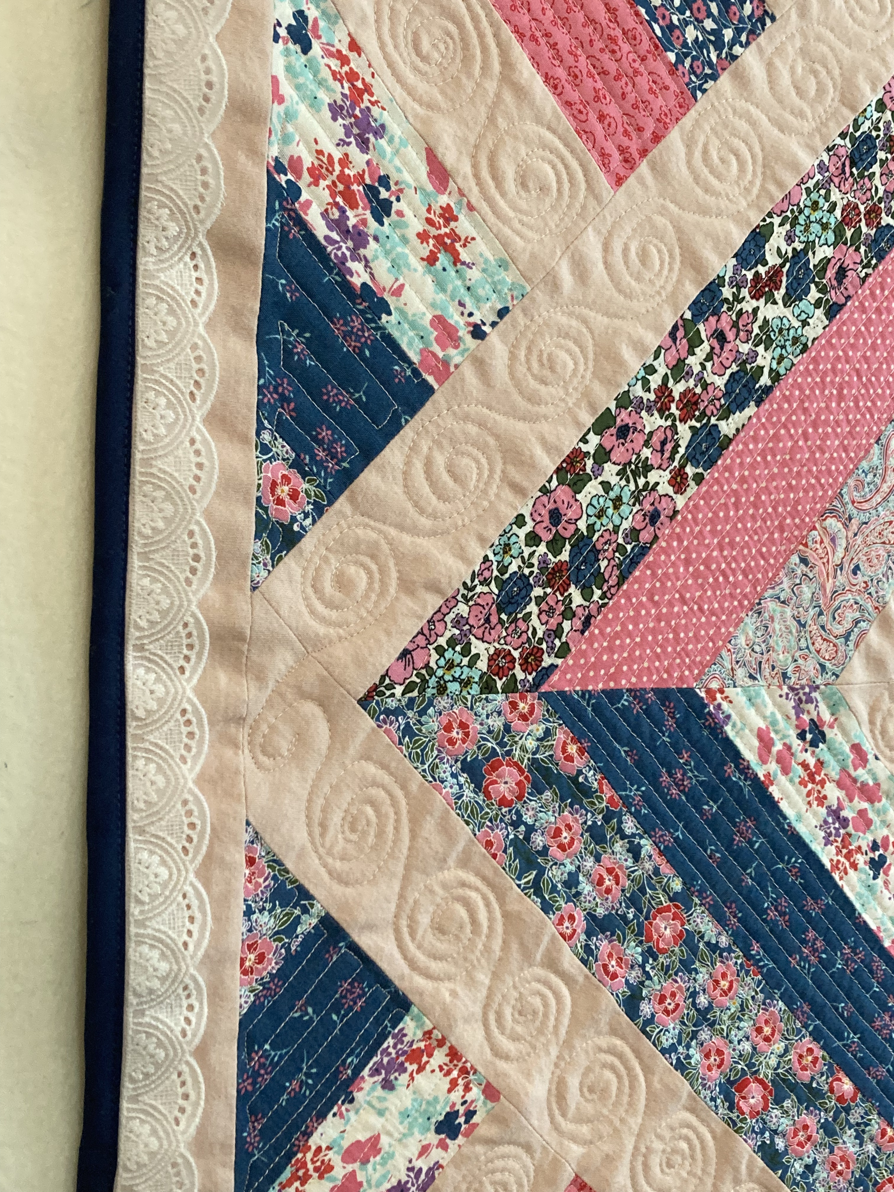 The print fabric was all from a single jelly-roll. The solid pink was from a soft, old child’s bedsheet — well worn and pre-loved. As far as techniques go, the piecing part was simple and the quilting was a combination of free-motion techniques that I’ve done on a few different projects. (Which clearly I need to keep practicing!) However, the addition of lace in the border was entirely new for me. Thanks to my sister for the suggestion. She was right — it adds just the right level of extra sweetness! I also learned some things about how to work with lace in a border.