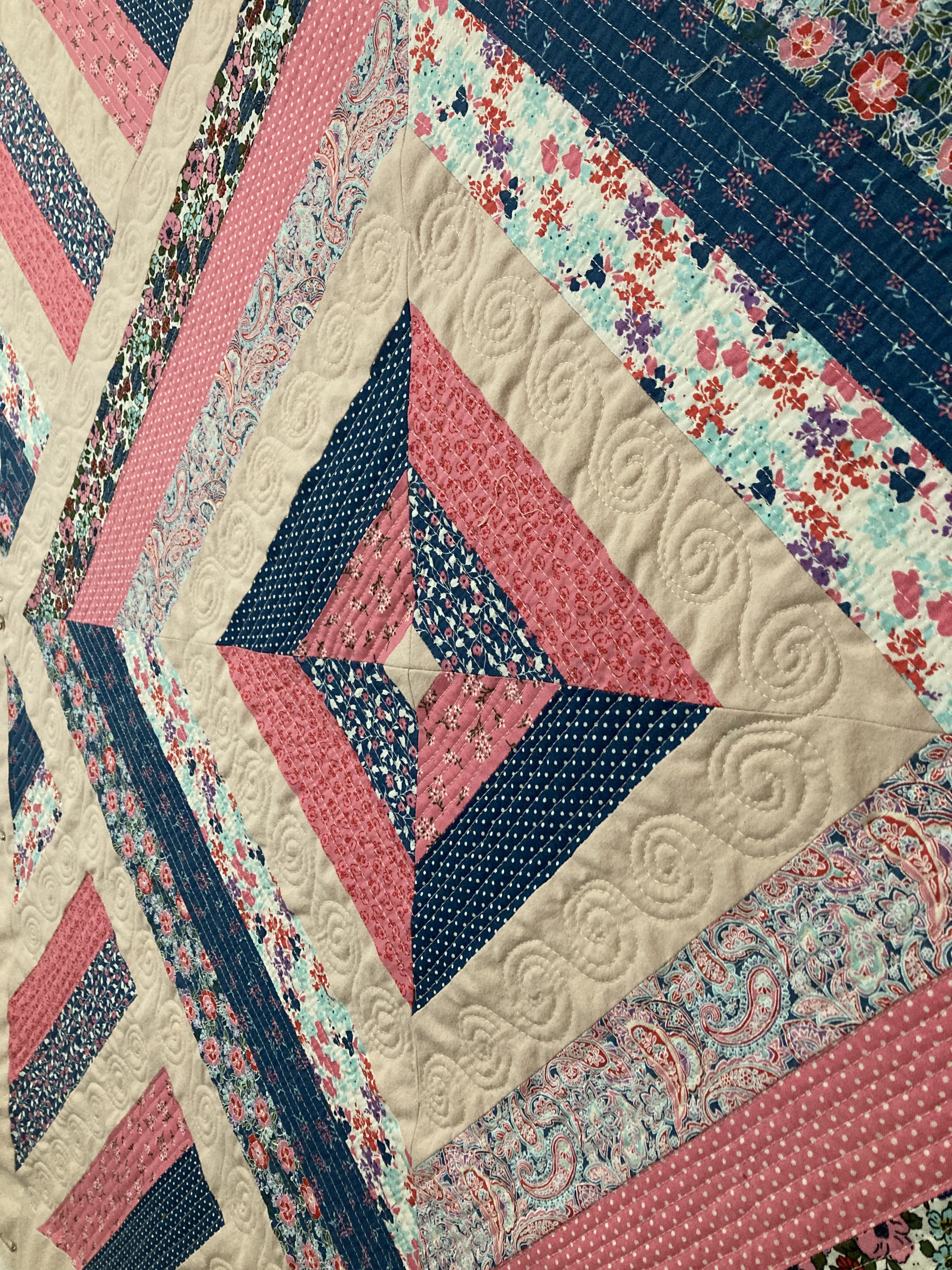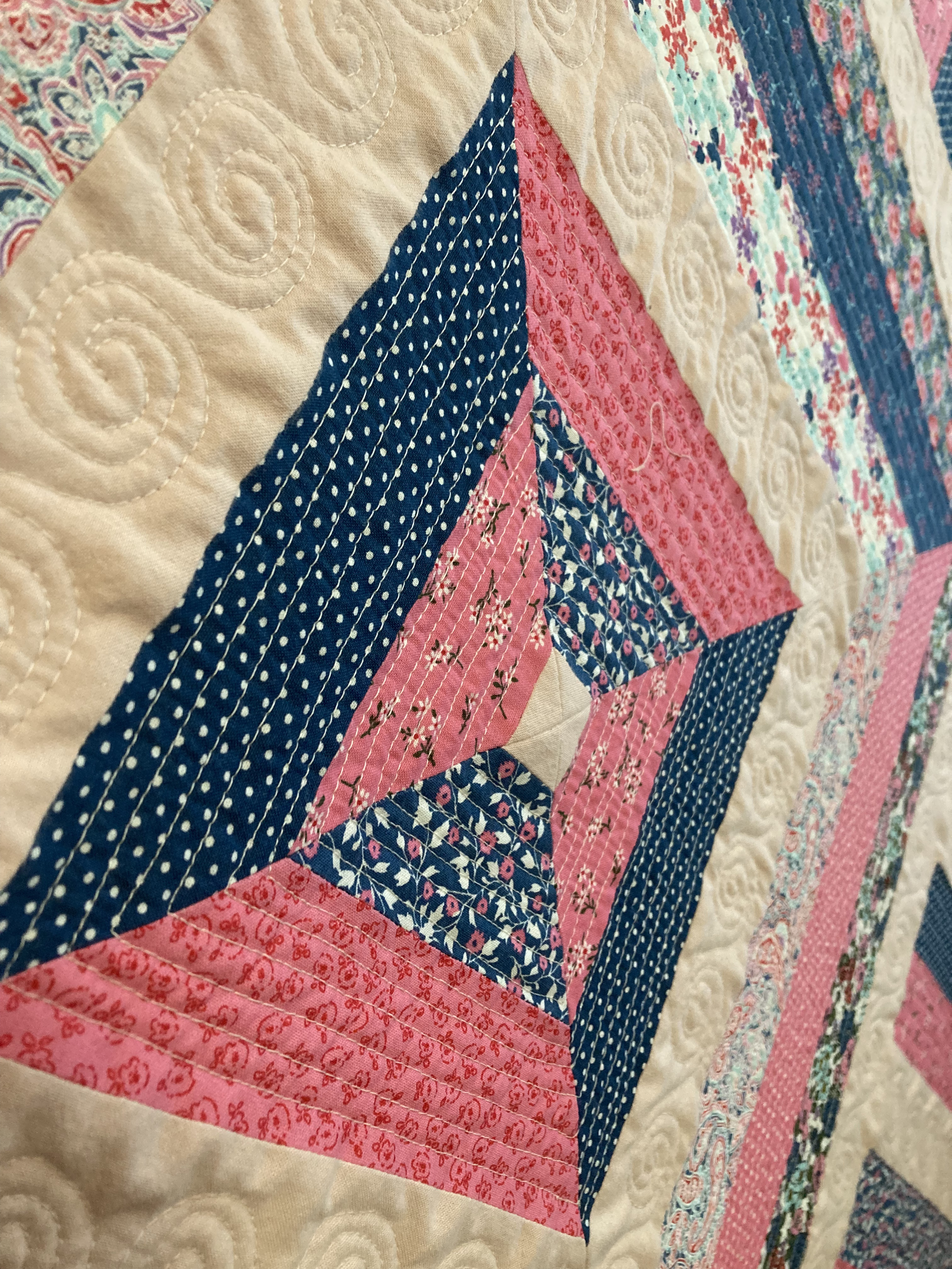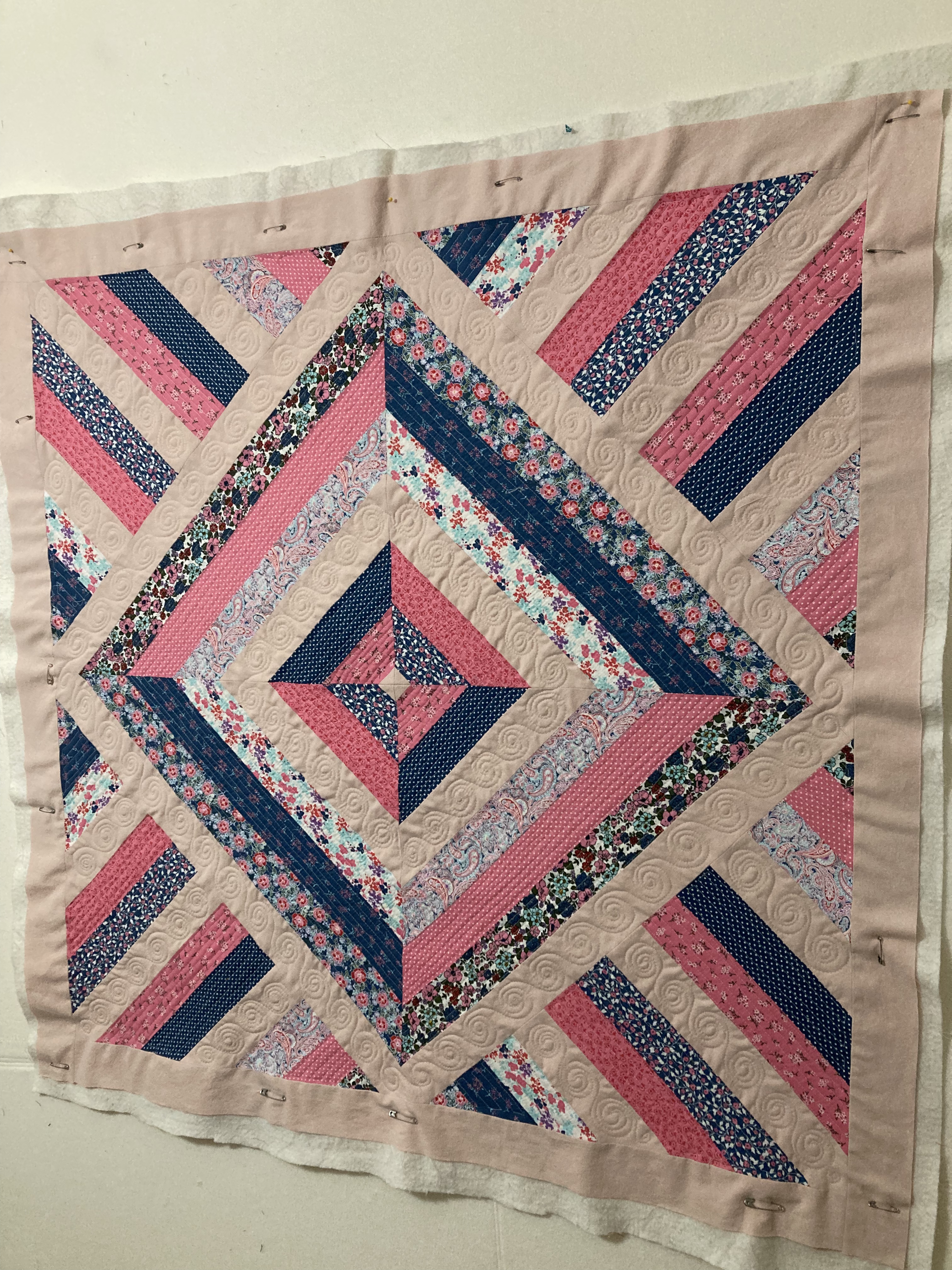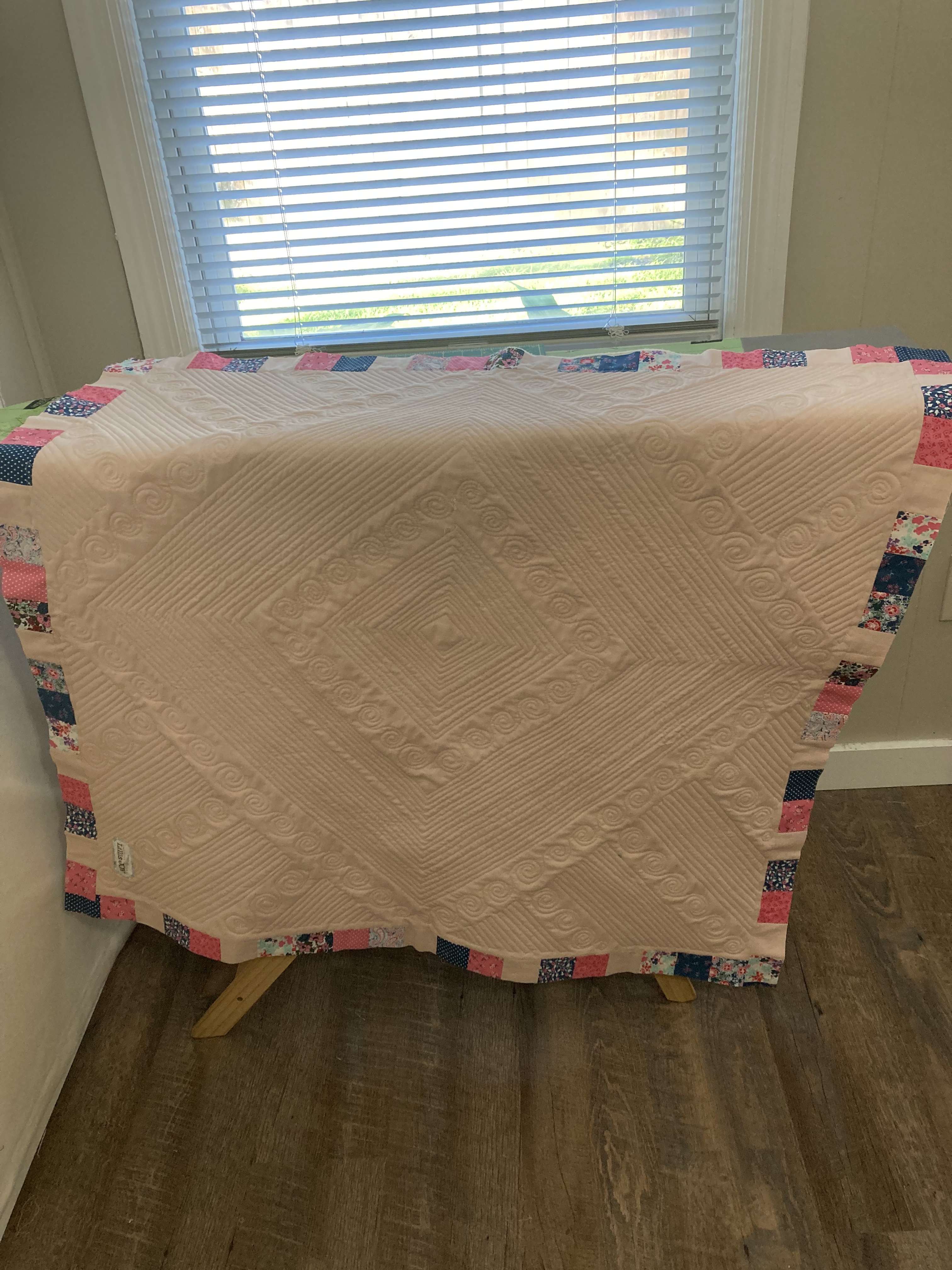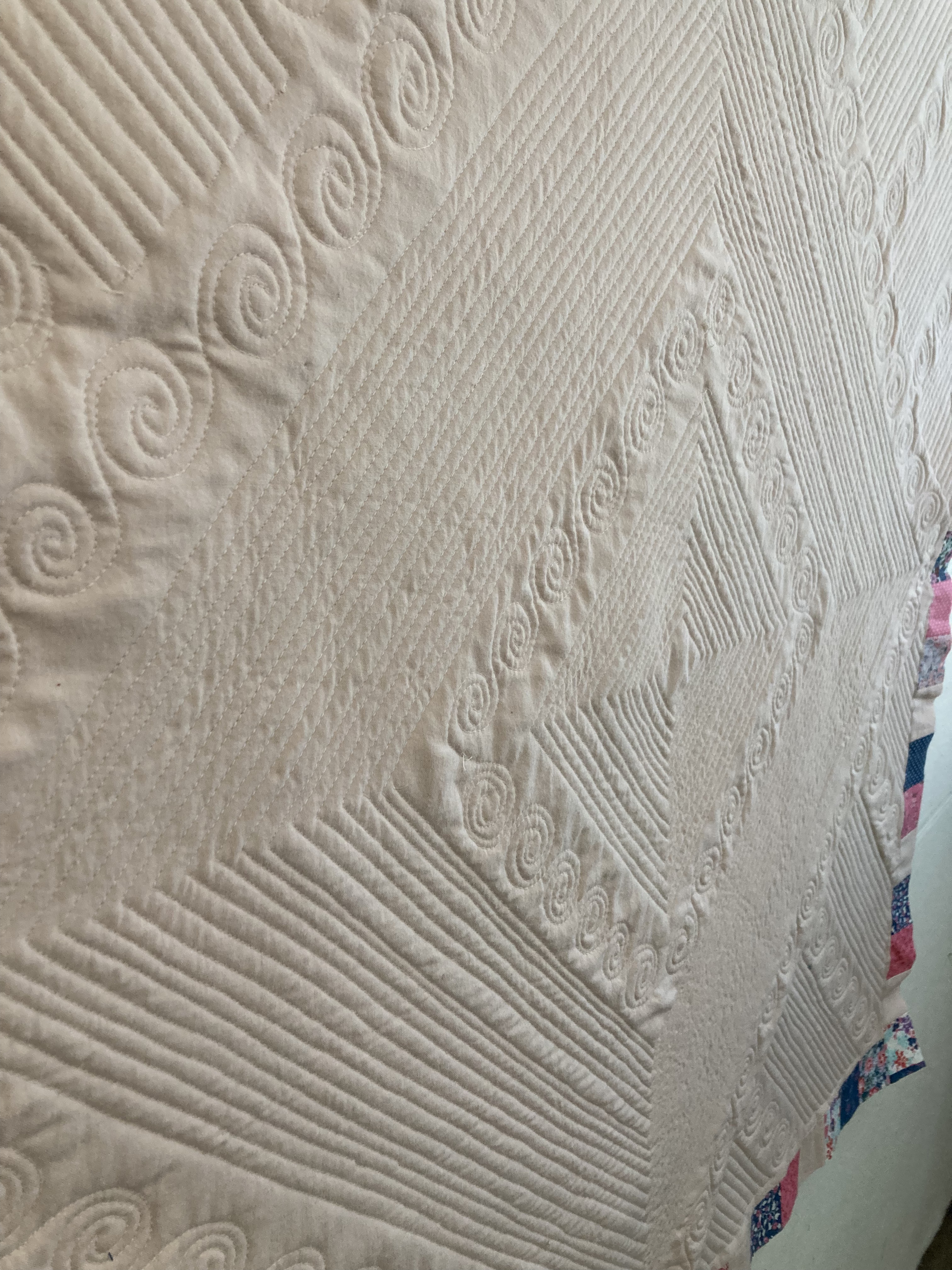 The print fabric was all from a single jelly-roll. The solid pink was from a soft, old child’s bedsheet — well worn and pre-loved. As far as techniques go, the piecing part was simple and the quilting was a combination of free-motion techniques that I’ve done on a few different projects. (Which clearly I need to keep practicing!) However, the addition of lace in the border was entirely new for me. Thanks to my sister for the suggestion. She was right — it adds just the right level of extra sweetness! I also learned some things about how to work with lace in a border.