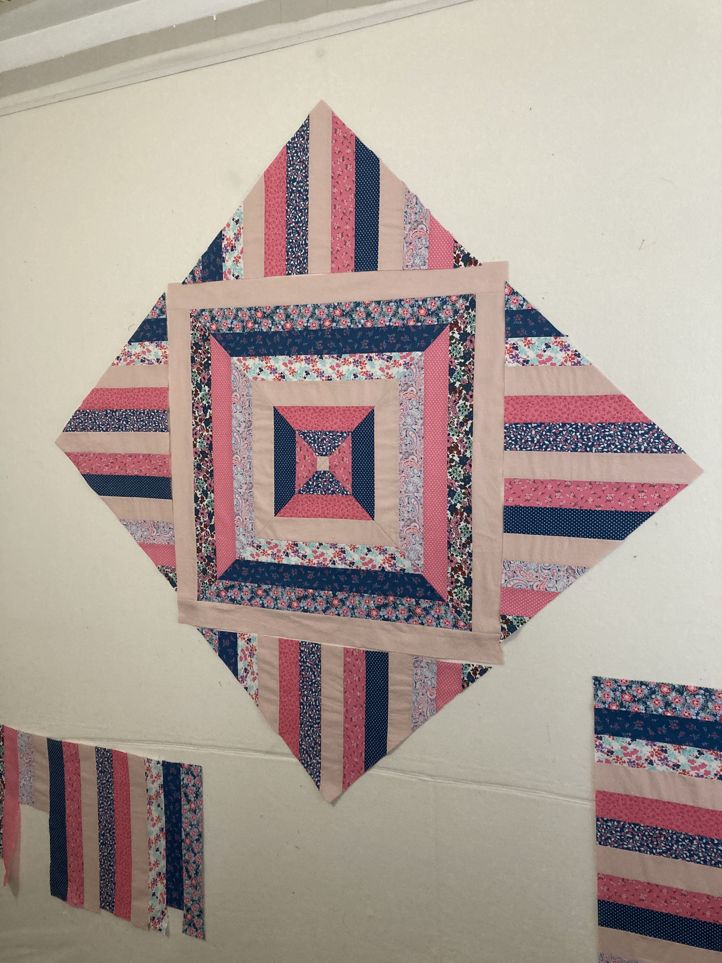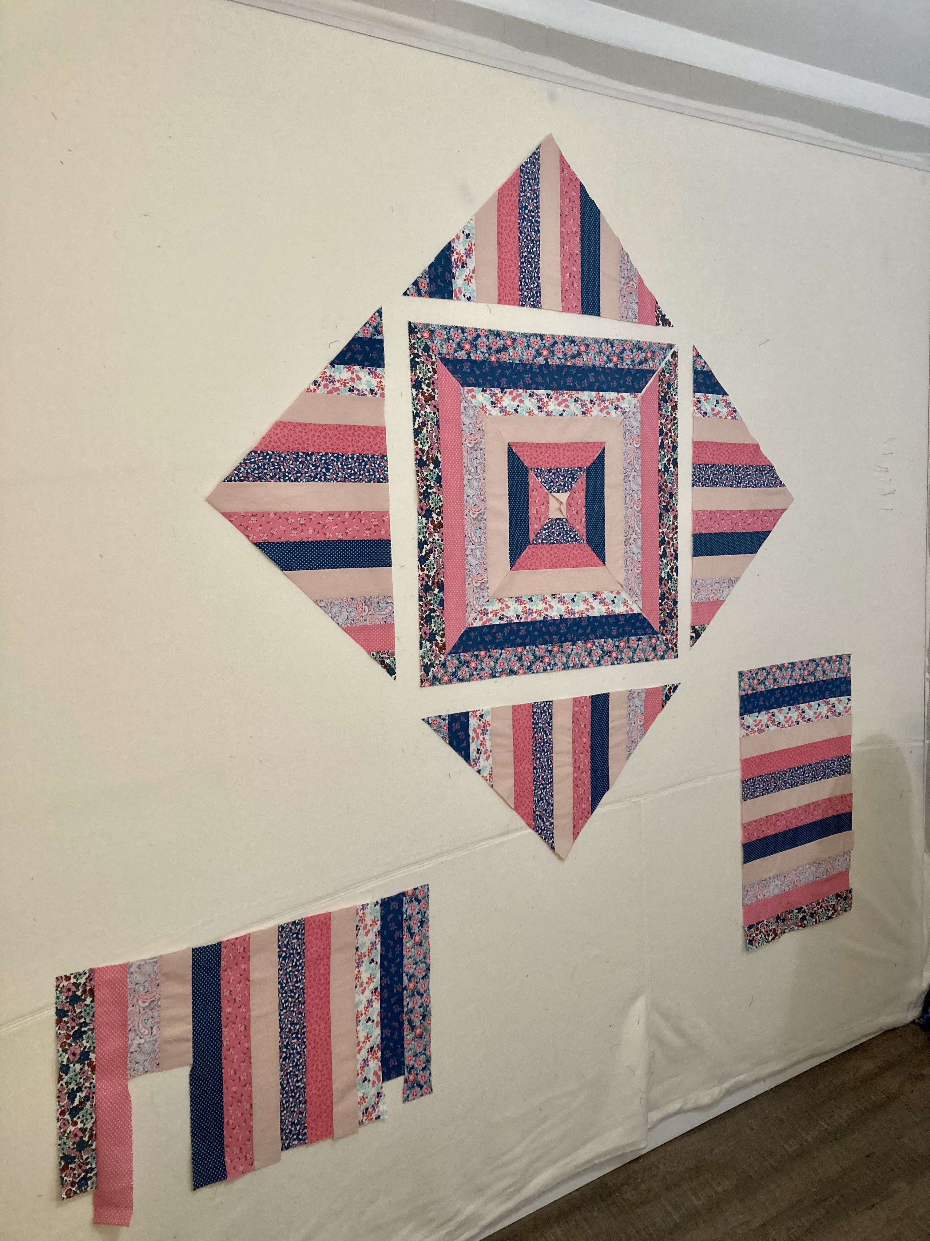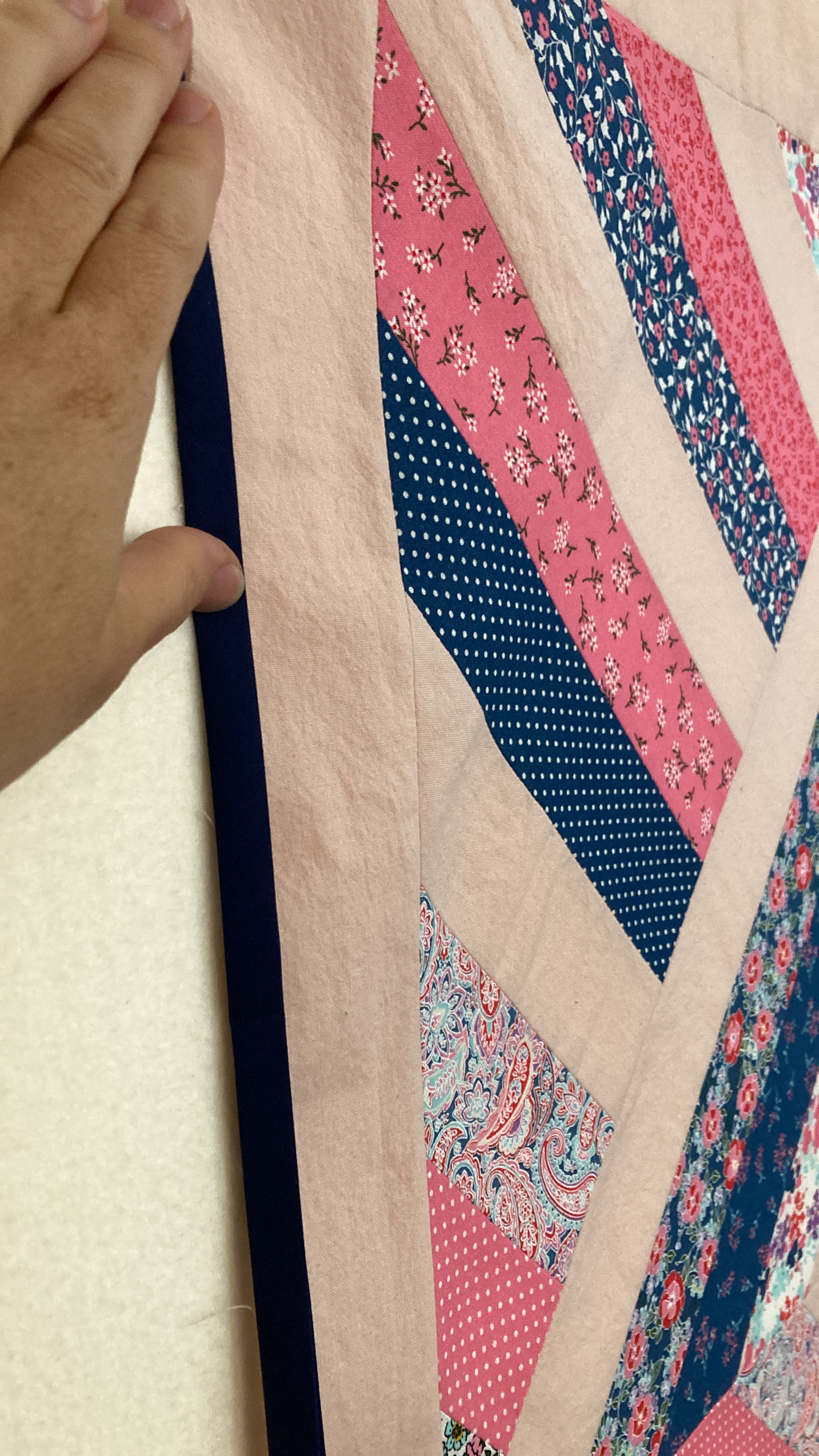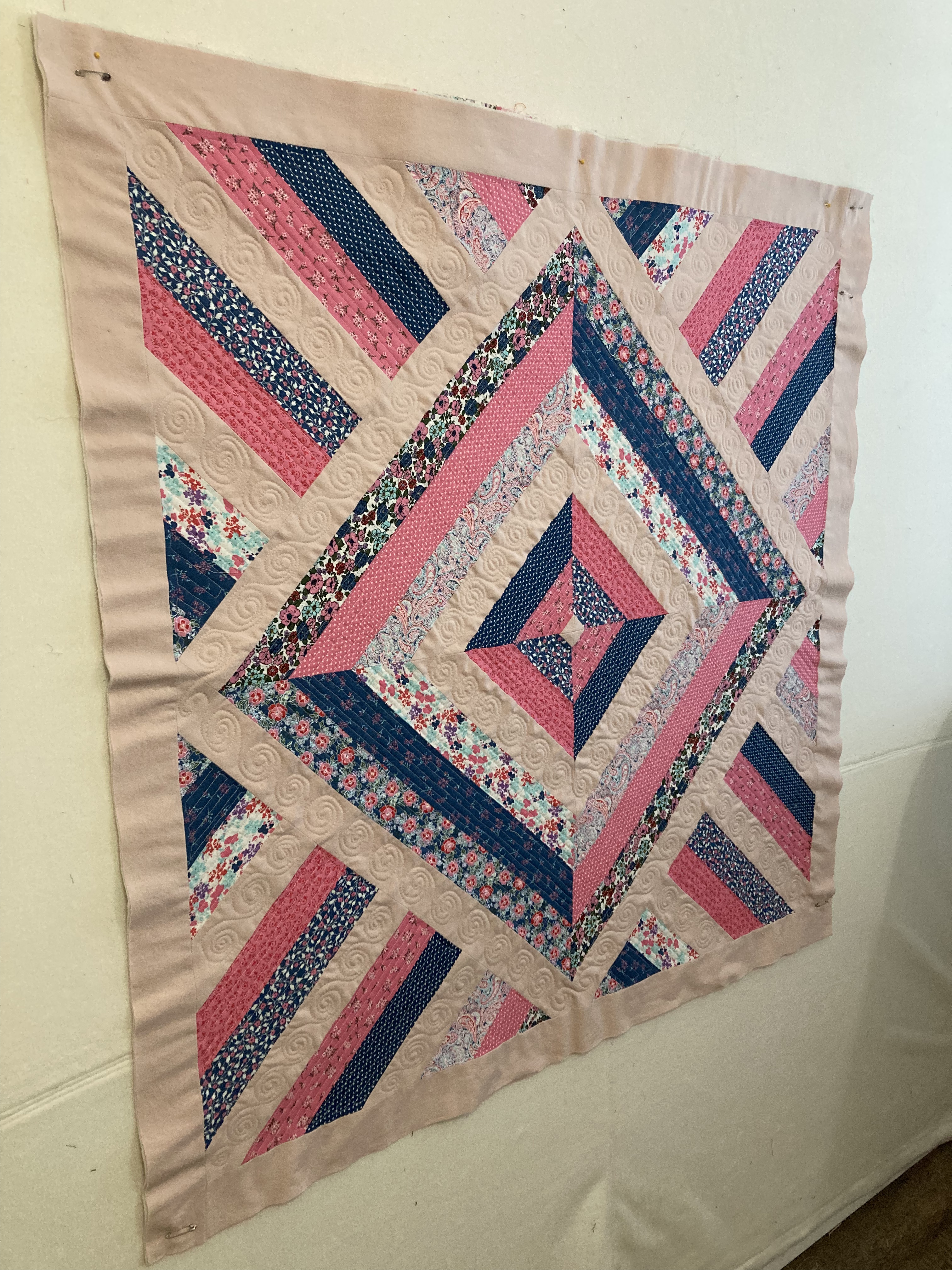 The print fabric was all from a single jelly-roll. The solid pink was from a soft, old child’s bedsheet — well worn and pre-loved. As far as techniques go, the piecing part was simple and the quilting was a combination of free-motion techniques that I’ve done on a few different projects. (Which clearly I need to keep practicing!) However, the addition of lace in the border was entirely new for me. Thanks to my sister for the suggestion. She was right — it adds just the right level of extra sweetness! I also learned some things about how to work with lace in a border.