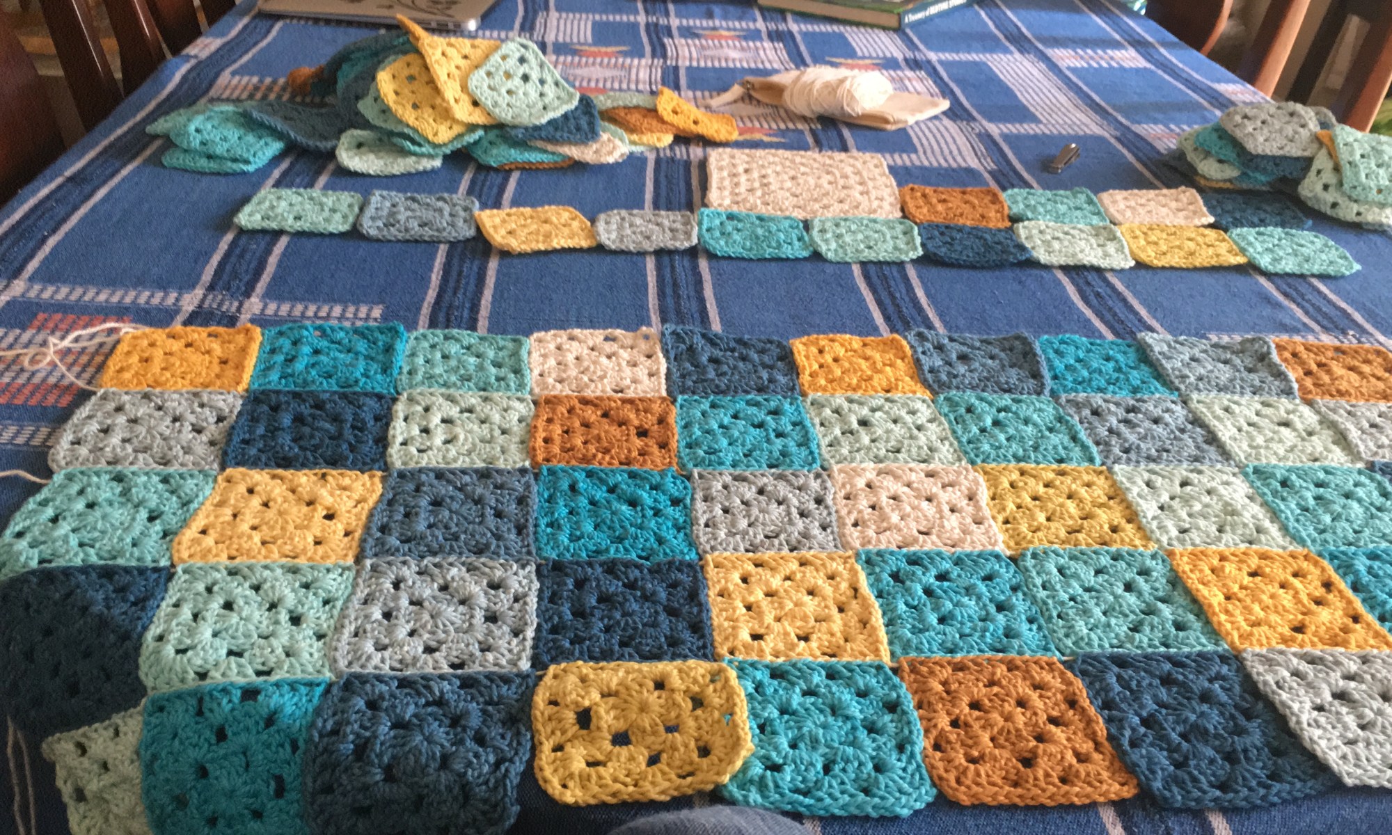 I love blue/gold color combos. Something about sand and sea perhaps? Sun and sky? I don't know but I love it. Another summer, another baby blanket to make. My sister just had her fourth boy. Since I would be heading her way by July, I threw the yarn and needles in my luggage in June …